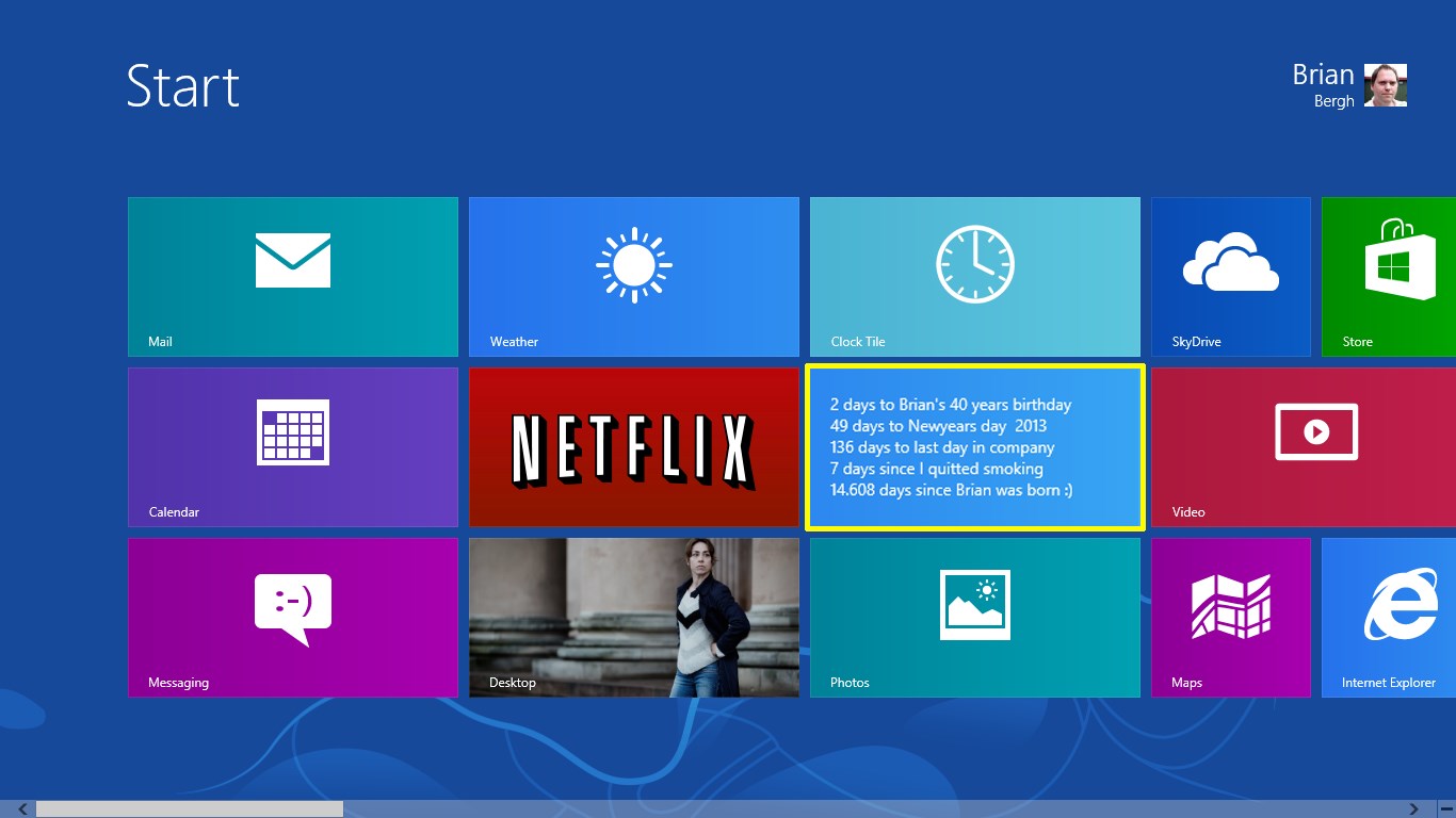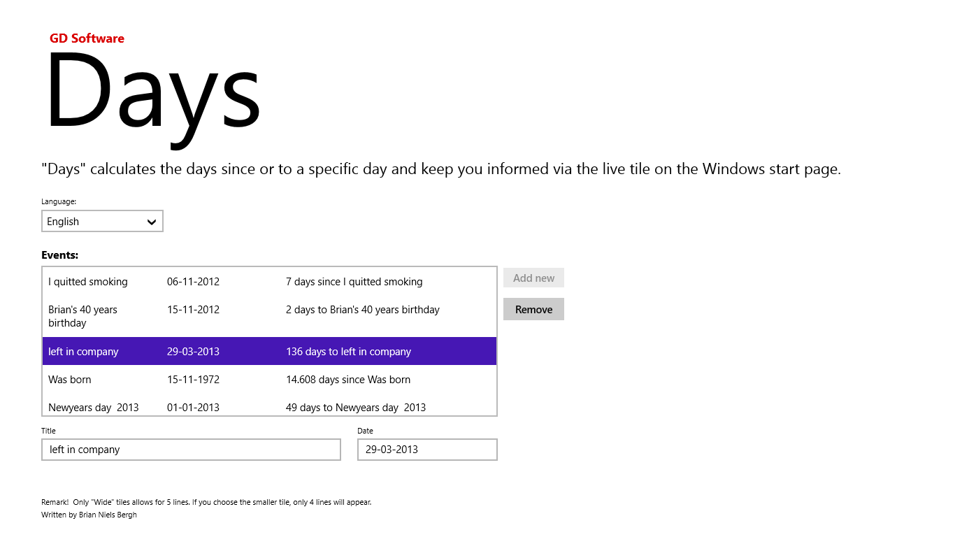 Day's is a simple application that lets you add up to 5 events (dates) which can be past or future. Day's will then show the events in a live tile on the Windows Start Page. Day's help you keep track of every day count-to or count-down's. Day's can also show the current date, time and week number.