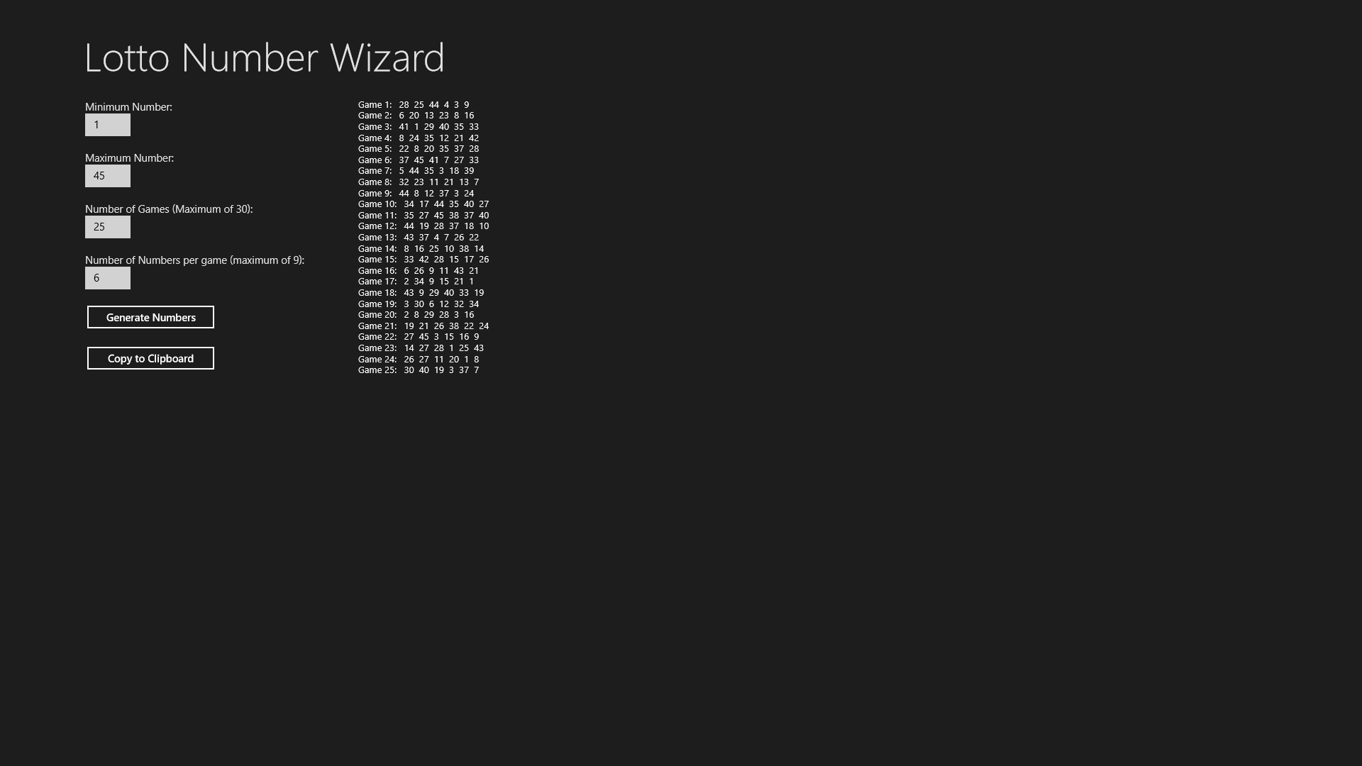 Select the range of numbers (1-99)Select the number of games (up to 30)Select the amount of numbers per gameCopy the generated numbers to the clipboard for use in other applications and for printingGood Luck!
