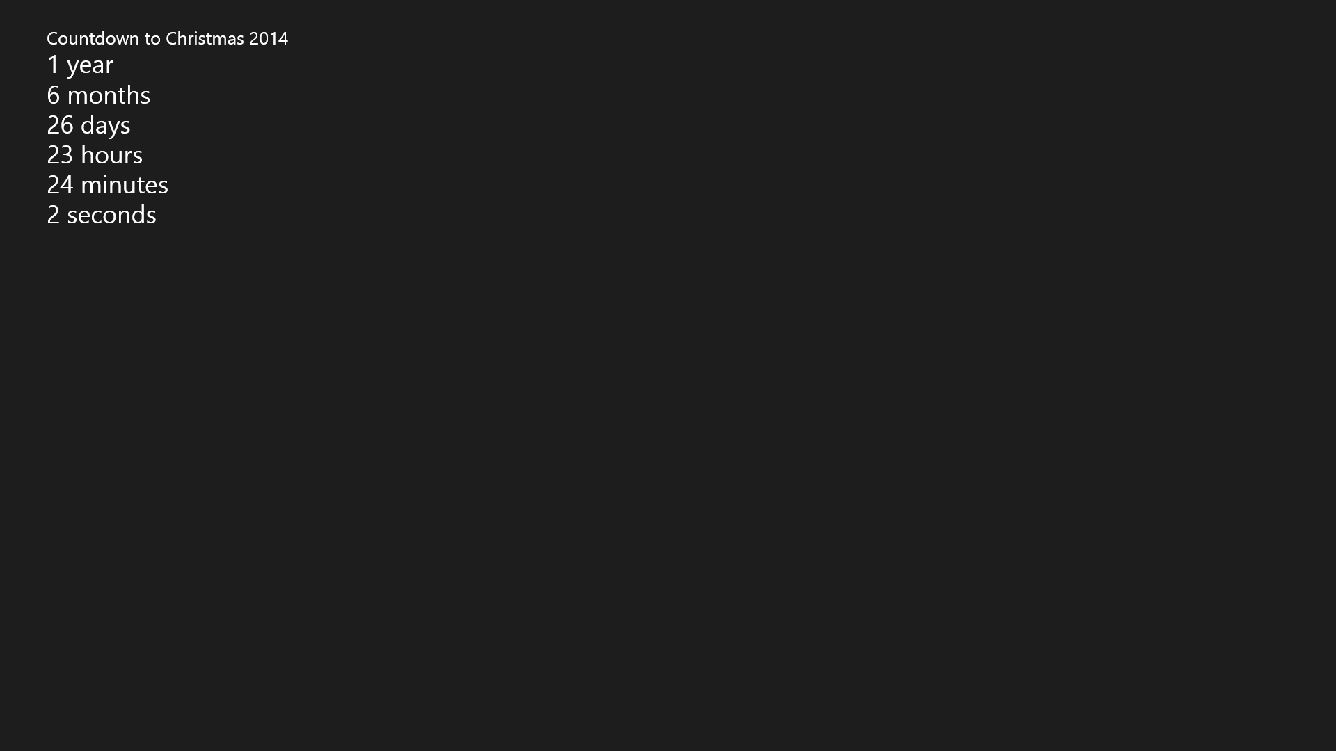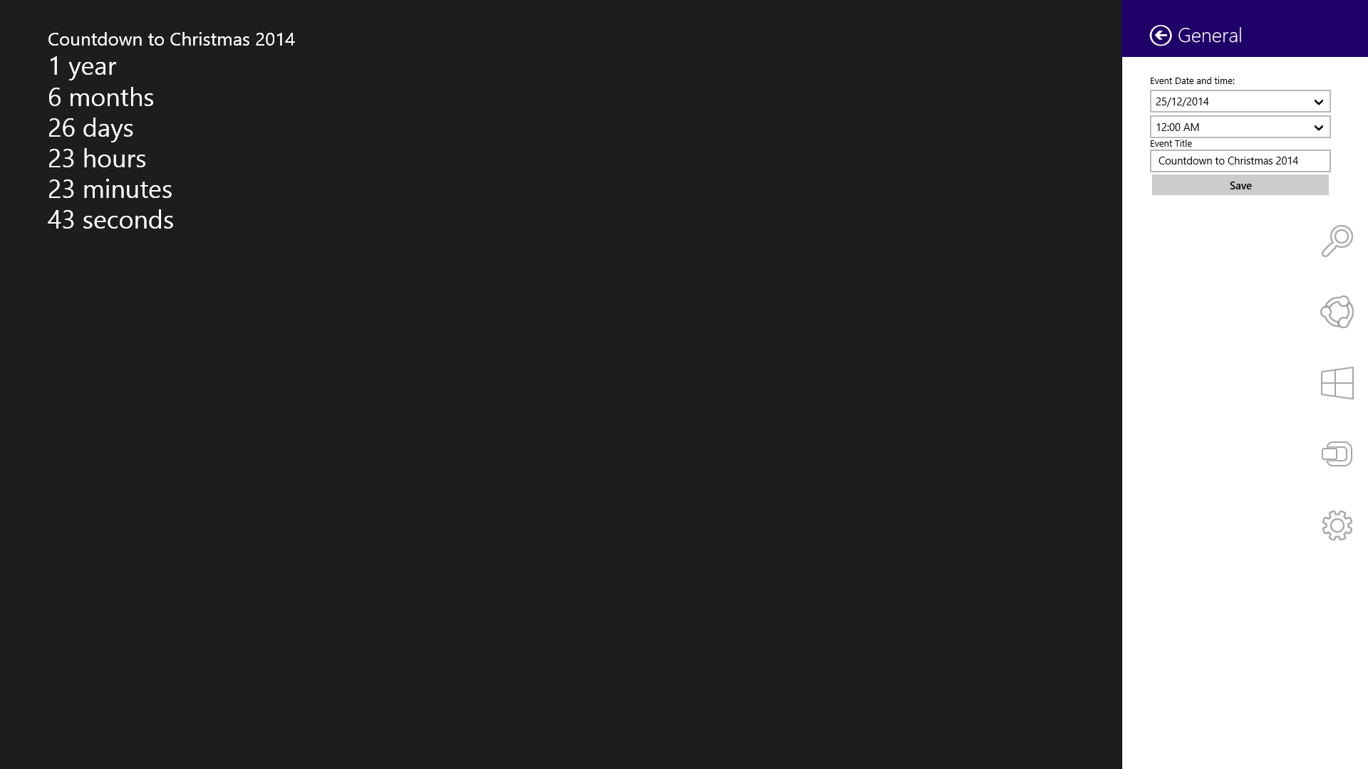 Define your own event to countdown toBreaks down the countdown into years, months, days, hours, minutes and seconds for easy readabilityEasy input of Date and Time of the event via a user friendly interfaceSnapped View support