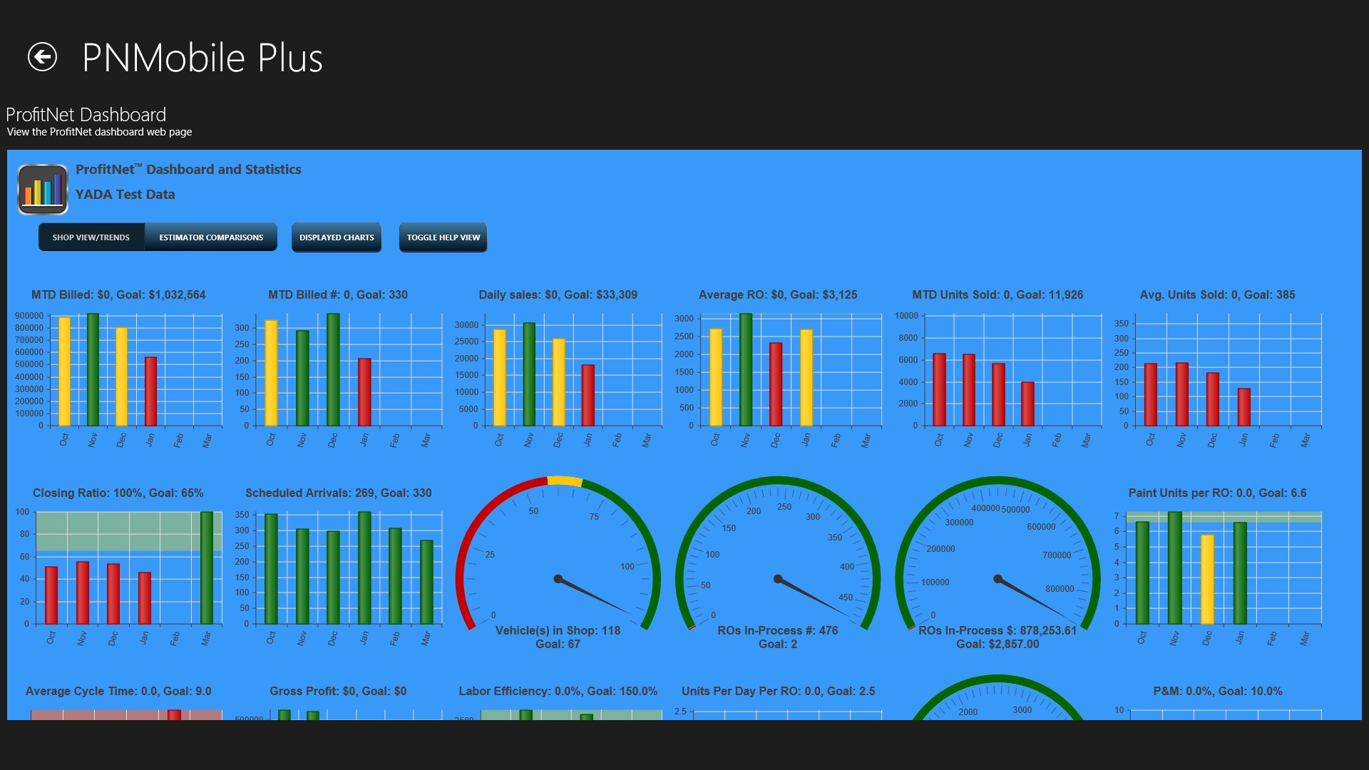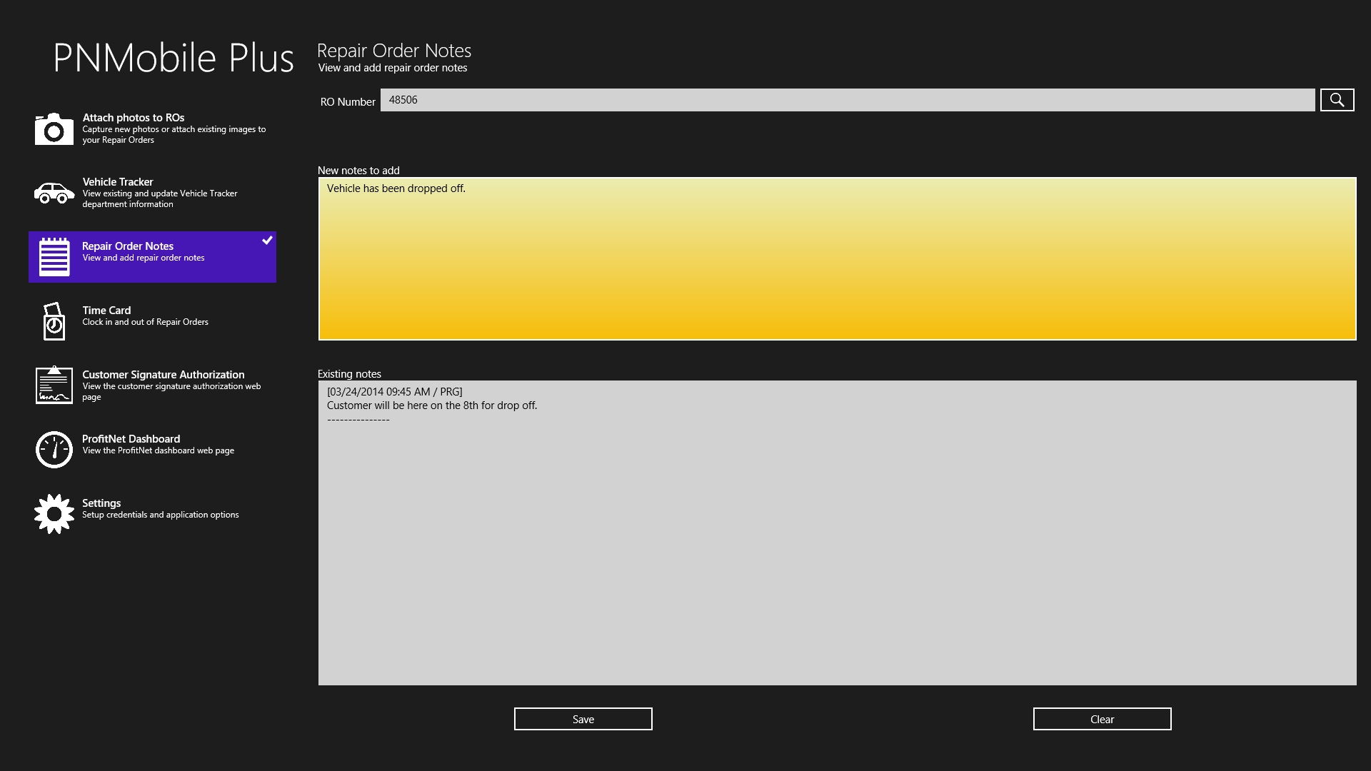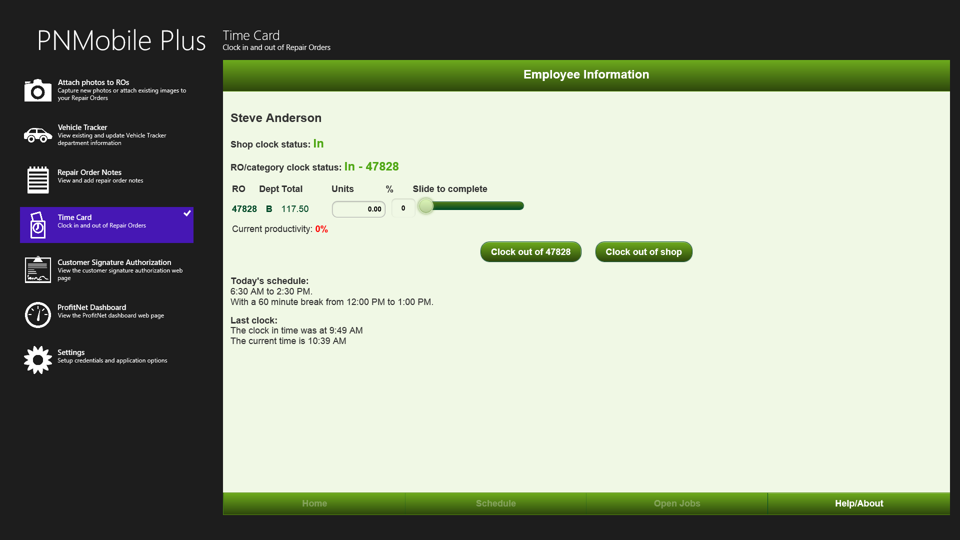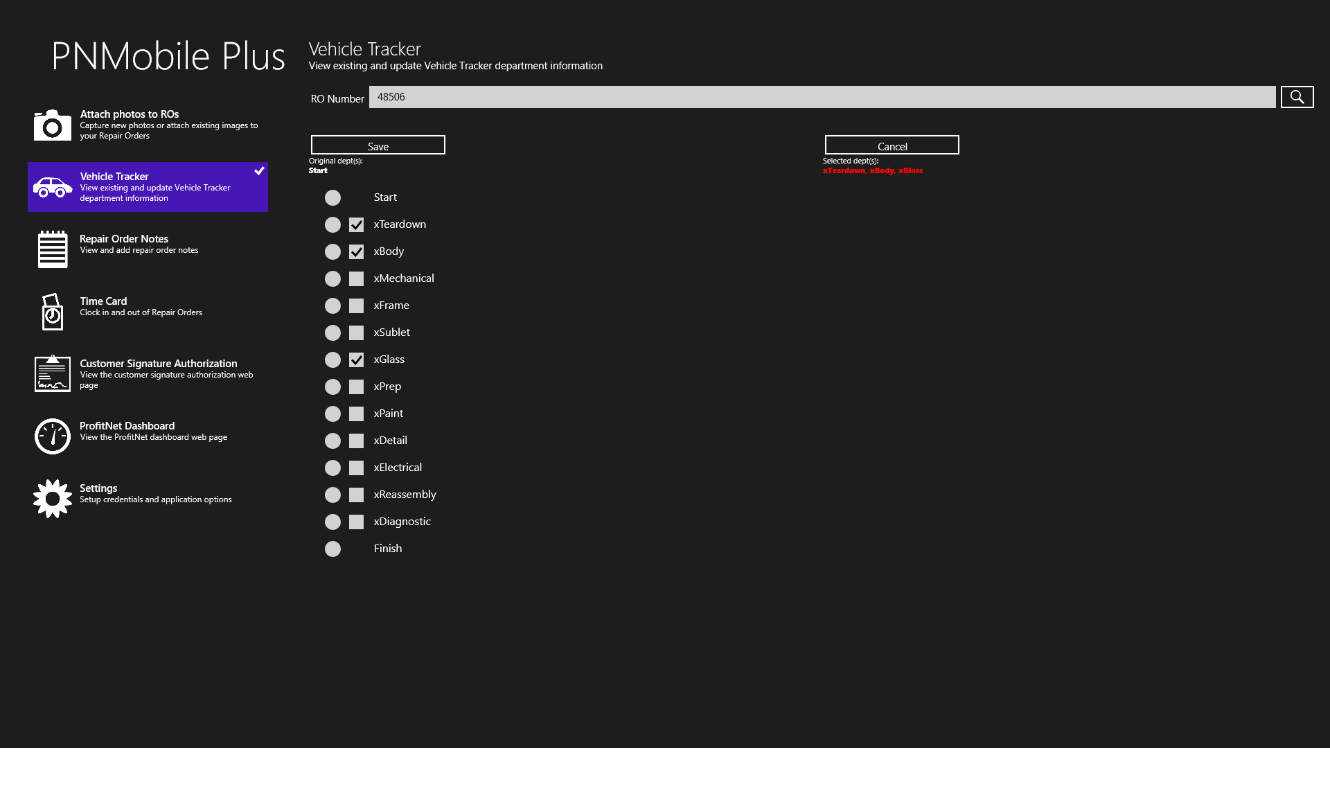 Mobile Time Card allows clocking in/out of jobs and flagging timeCustomer Authorization function for signed document entryProfitNet Dashboard to monitor shop statisticsMultiple credential sets for multi-shop usersFind vehicles quickly by searching on multiple fieldsMonitor/update production statusTake and upload photos of vehicles and include descriptionsAdd notes to repair orders
