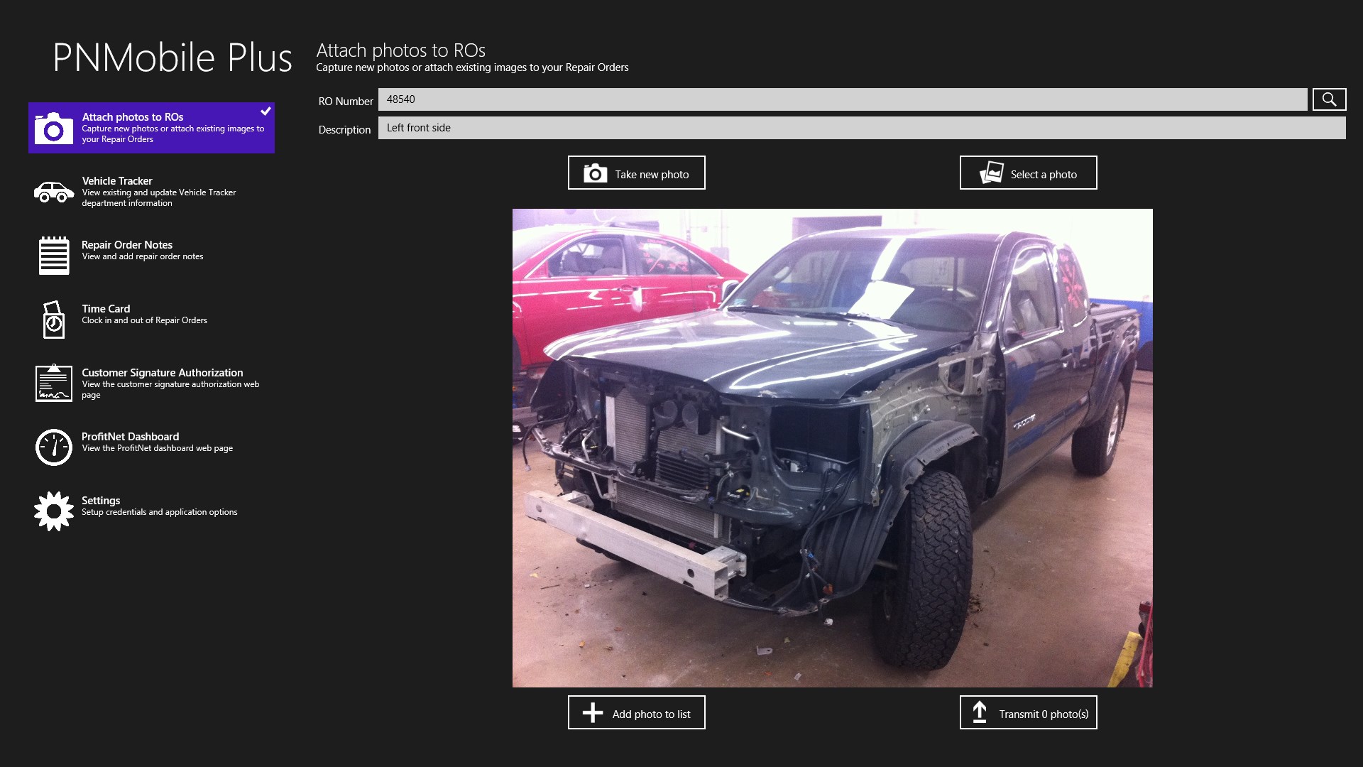 The ProfitNet™ Mobile Plus application for Windows 8.1, and Windows 10 allows you to remotely monitor and update the progress of vehicle repairs within your shop. Designed to work exclusively with the ProfitNet™ Body Shop Management System, ProfitNet™ Mobile Plus allows you to take and upload photos, monitor vehicle status and write notes without being tied to a desk.