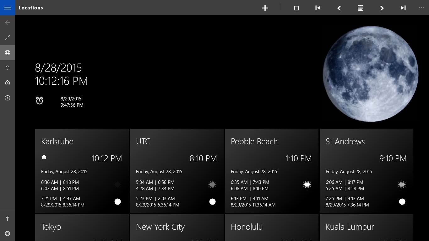Moon Alarm combines a world clock, an alarm clock, a timer and a stopwatch and displays - for your favorite places - when the sun rises and sets, the beginning and end of twilight, and when the moon rises and sets. Last but not least, it shows the moon phases and a daily matching image of the moon.