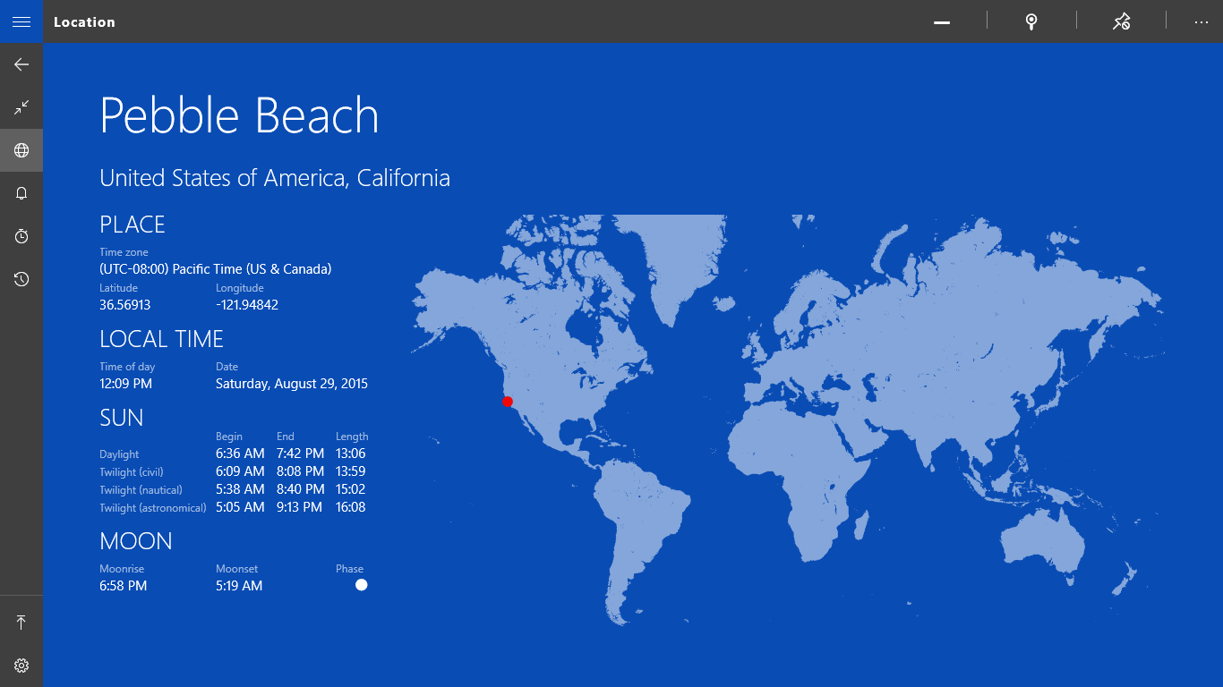 It\'s a clock showing times around the world.It\'s an alarm clock.It\'s a timer.It\'s a stopwatch.It displays times of sun rise, sun set, twilight, moon rise and moon set.It displays moon phases and each day a matching image of the moon.It uses secondary tiles at Windows Start page.Cortana now understands a sentence such as: "Countdown 9 minutes"