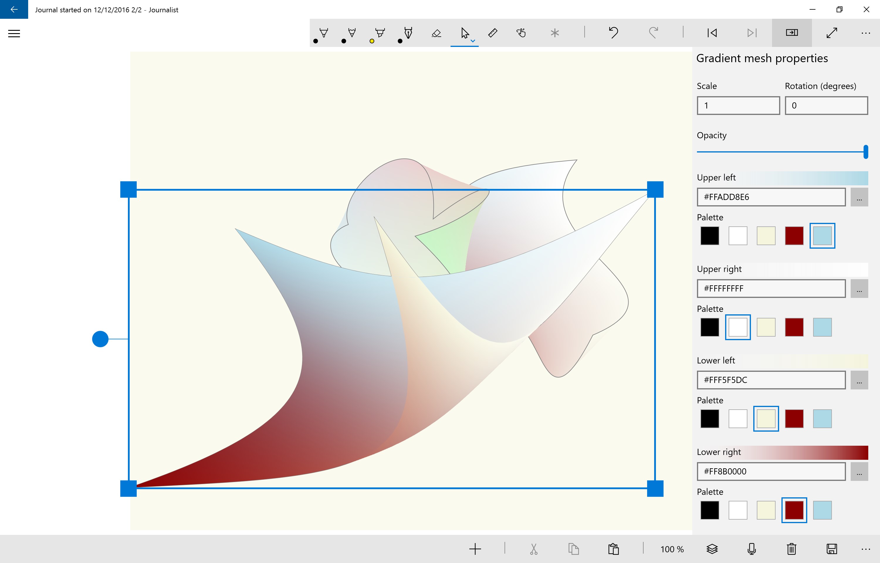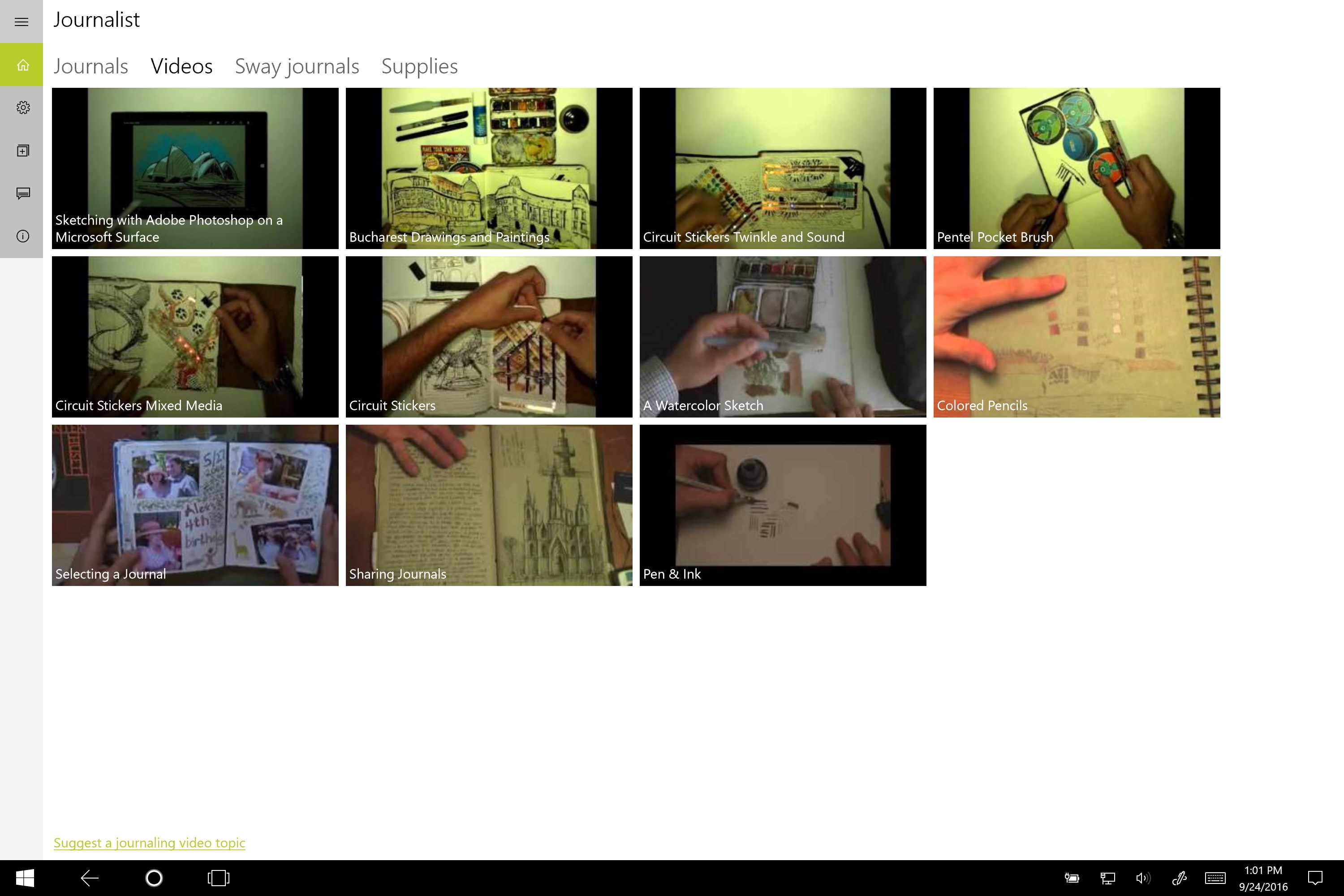 Draw with Windows Ink with pens, pencils, and the ruler (not on Xbox). For devices without pens, you can draw with a finger or mouse using the touch drawing mode.Create multi-media pages with drawing, pictures, text, videos, and audioUse voice commands to control Journalist while creating pagesPin journals or pages to the start screen Drag and drop files onto journal pages.Cut, Copy and paste items onto journal pages.Extensible with page item and export extensions.Create 3D images with depth maps to upload to Facebook.Share content from other apps: text, URLs, bitmaps, HTML, RTF, .png, .jpg, .jpeg, .bmp, .gif, .jxr, .tif, .tiff, .mp4, .wmv, .mp3, .m4a, .txt, .rtfExport journals as HTML pages, images, or videos.Create 360 Drawing that can be viewed on Facebook\'s 360 Photo Viewer or 360 picture-viewing apps.Draw with the shadow, glow, and blur pens. (not on Xbox)Insert journal pages as images in other apps using the file picker.Save pages as PNG, SVG, JPEG, TIF, JXR, GIF, MP4, WMV, or AVICreate vertical or horizontal parallax scrolling pages - adn save the pages as videosInsert Video, audio, images onto pages: .png, .jpg, .bmp, .gif, .jxr, .tif, .mp4, .wmv, .mp3, .svgInsert 4-color gradient meshes onto pages.Create 3D drawings with the Isometric drawing mode.
