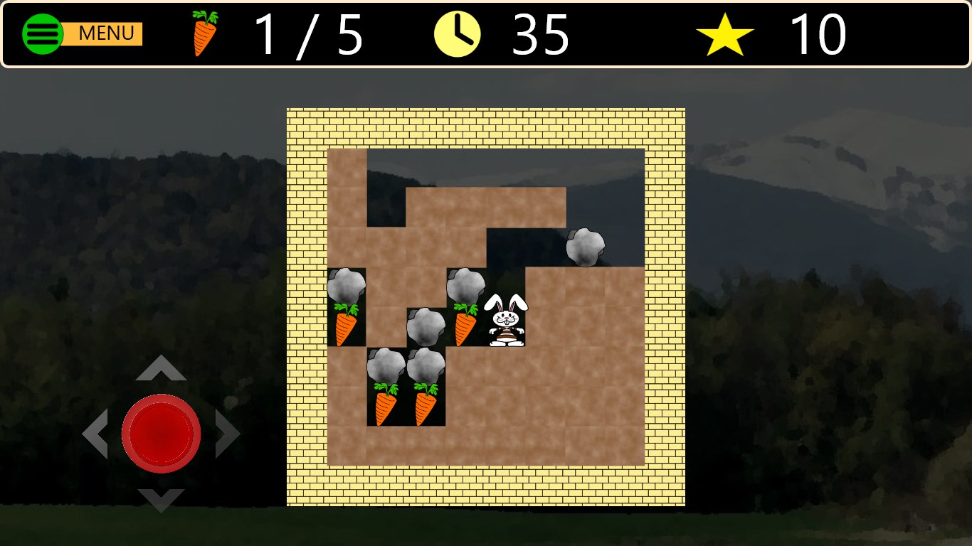 Help Rocky collect enough carrots to open the exit portal in each level. Dodge boulders and avoid contact with enemies to get to the carrots.
