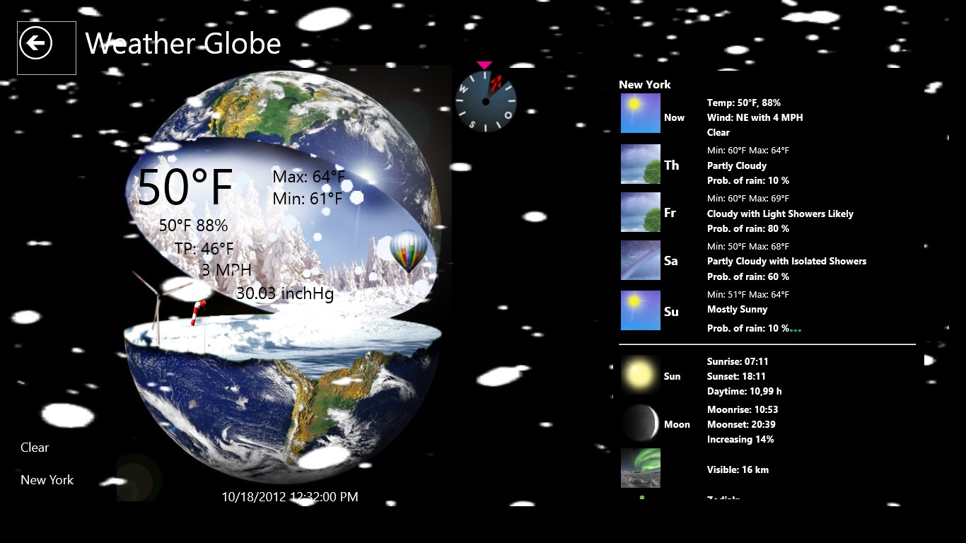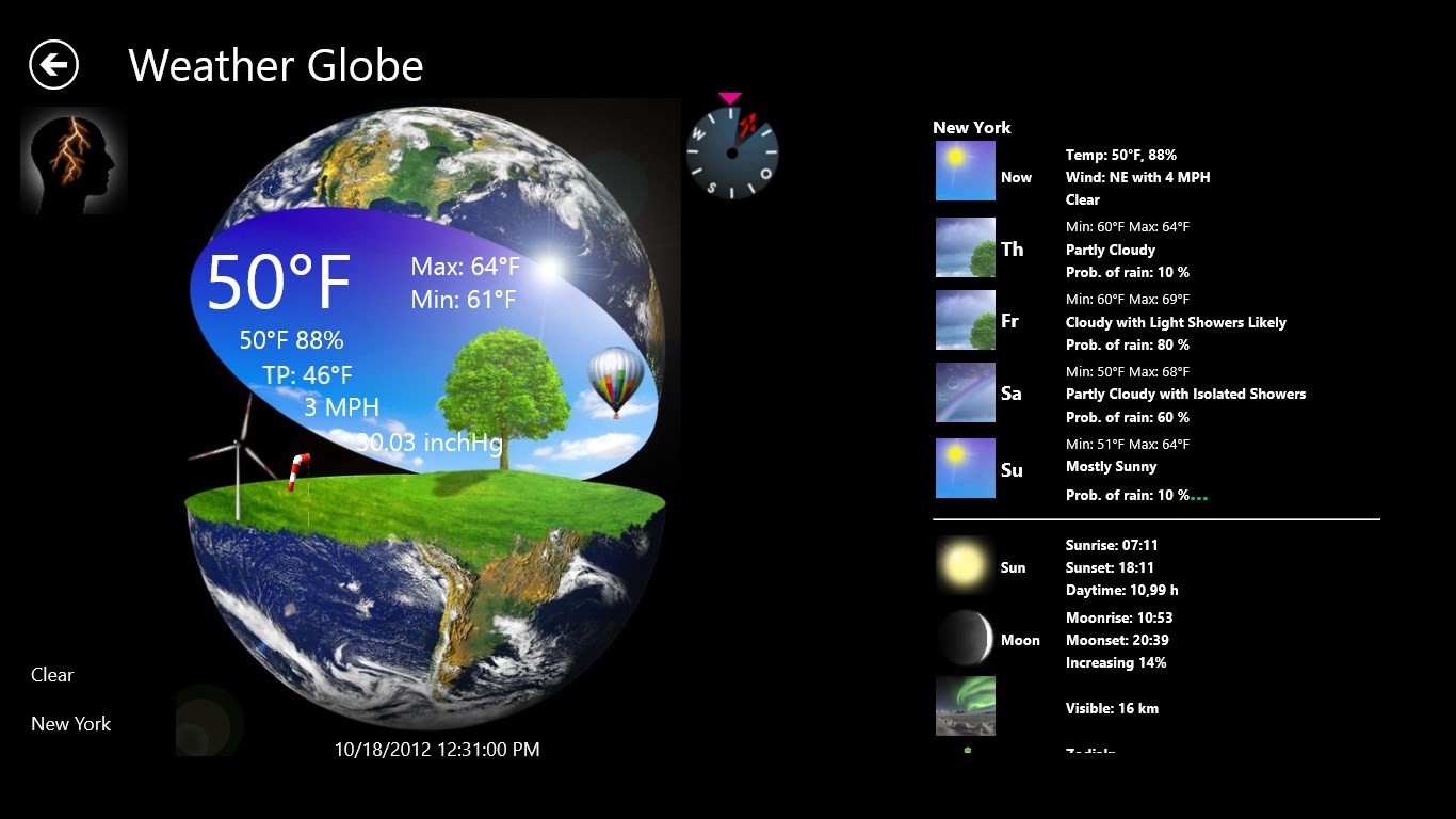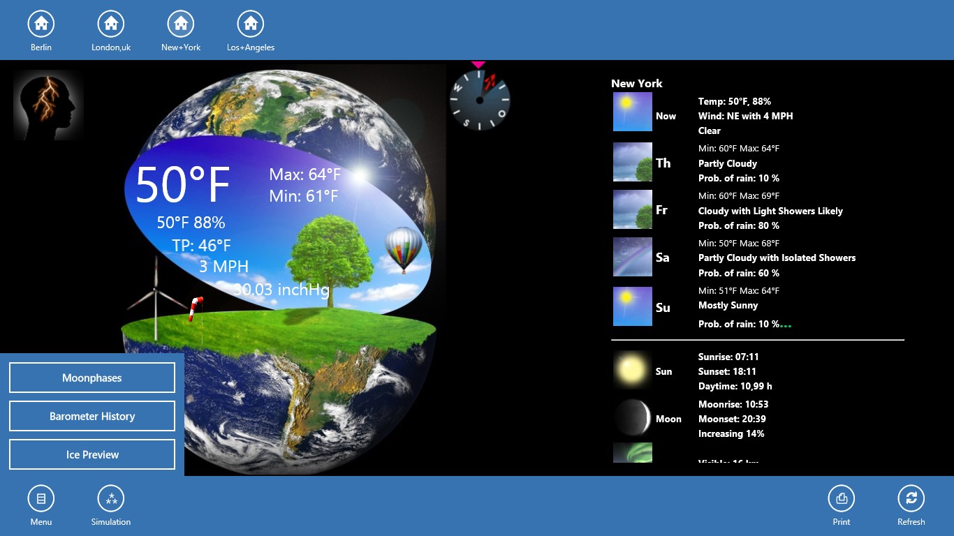 Use your Windows 8 and 10 PC as right weather station. Large temperature display, wind chill, humidity, wind speed, wind direction, barometer, moon phase and more values can hardly be desired. With this design you have fun at the Weather Globe. A 4-day Forecast is integrated.
