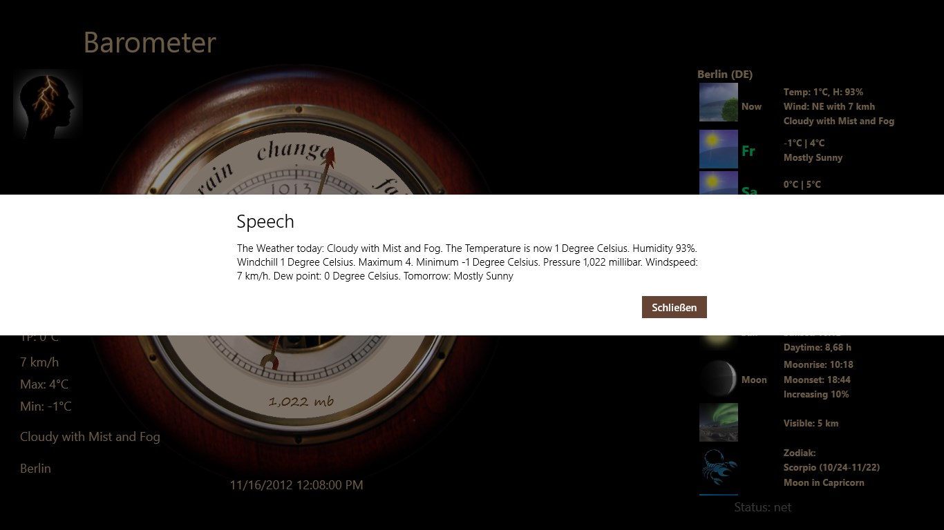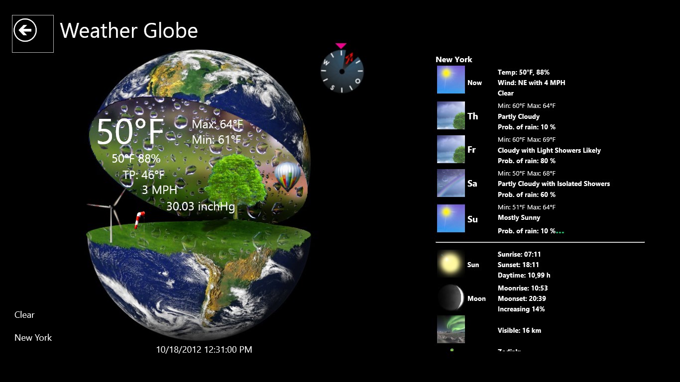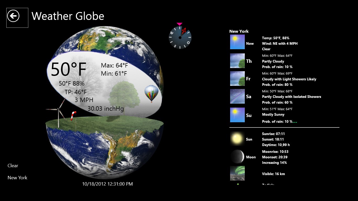 Use your Windows 8 and 10 PC as right weather station. Large temperature display, wind chill, humidity, wind speed, wind direction, barometer, moon phase and more values can hardly be desired. With this design you have fun at the Weather Globe. A 4-day Forecast is integrated.