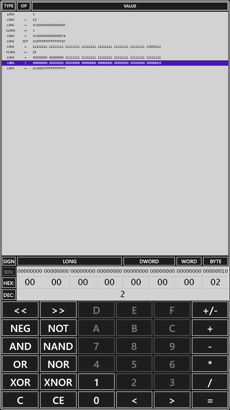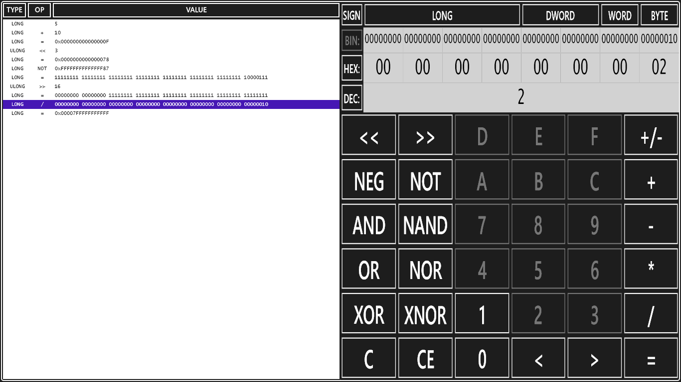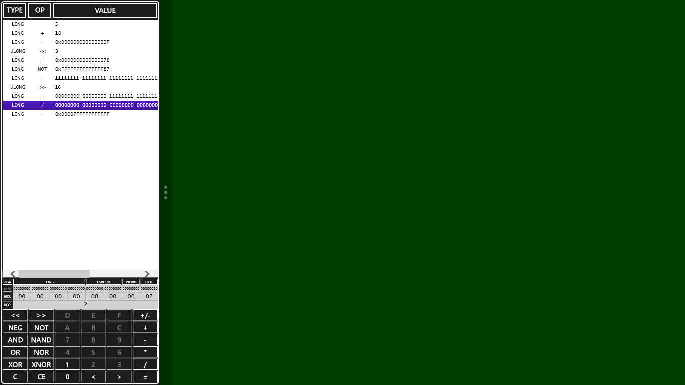Binary, hexadecimal and decimal base conversion.Wide range of logical operators.Signed and unsigned values.Large memory sheet helps you build algorithms.Educational tool to play with numbers, bits and bytes.