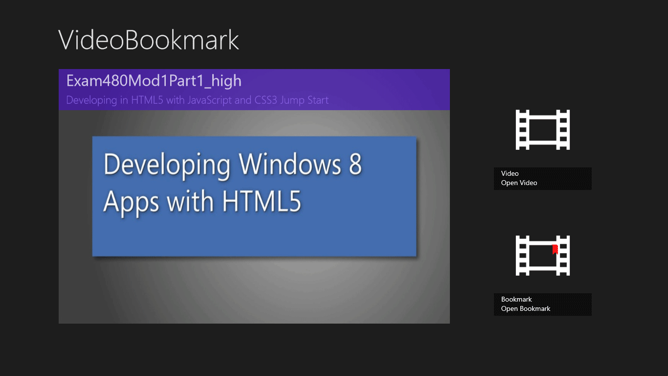 VideoBookmark is a full-screen video play application. Users can mark now position without interrupt the video playing. Users can also adjust or remove the bookmarks after they watch the video finish.