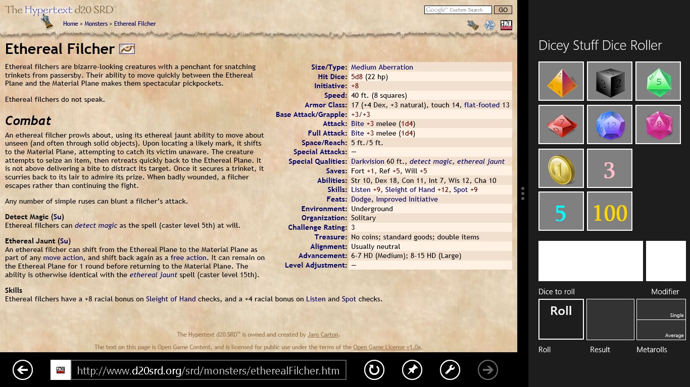 Dicey Stuff Dice Roller is a virtual dice-bag that allows you to role any simple or complex set of dice in whatever game you're in. Whether it's 4d6+24 or 3d10-1 you need to roll, Dice Roller has got you covered. Even some of the harder to get dice, like D3's and D5's are available.