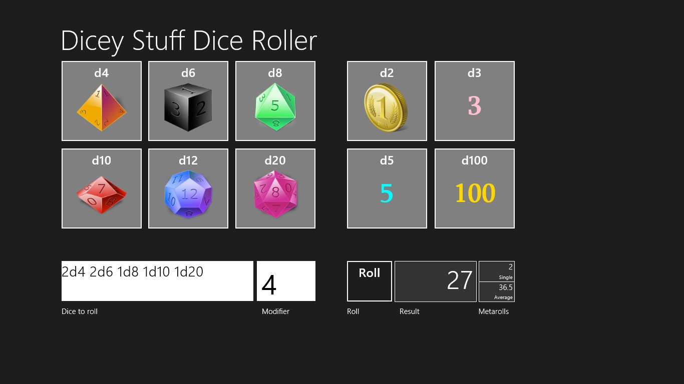 Can roll any combination of D2,D3,D4,D5,D6,D8,D10,D12,D20 and D100Calculates averages as wellLooks great, even in Snapped ModeCan be used in pretty much any game that used diceAd-free (for a limited time), always free of charge