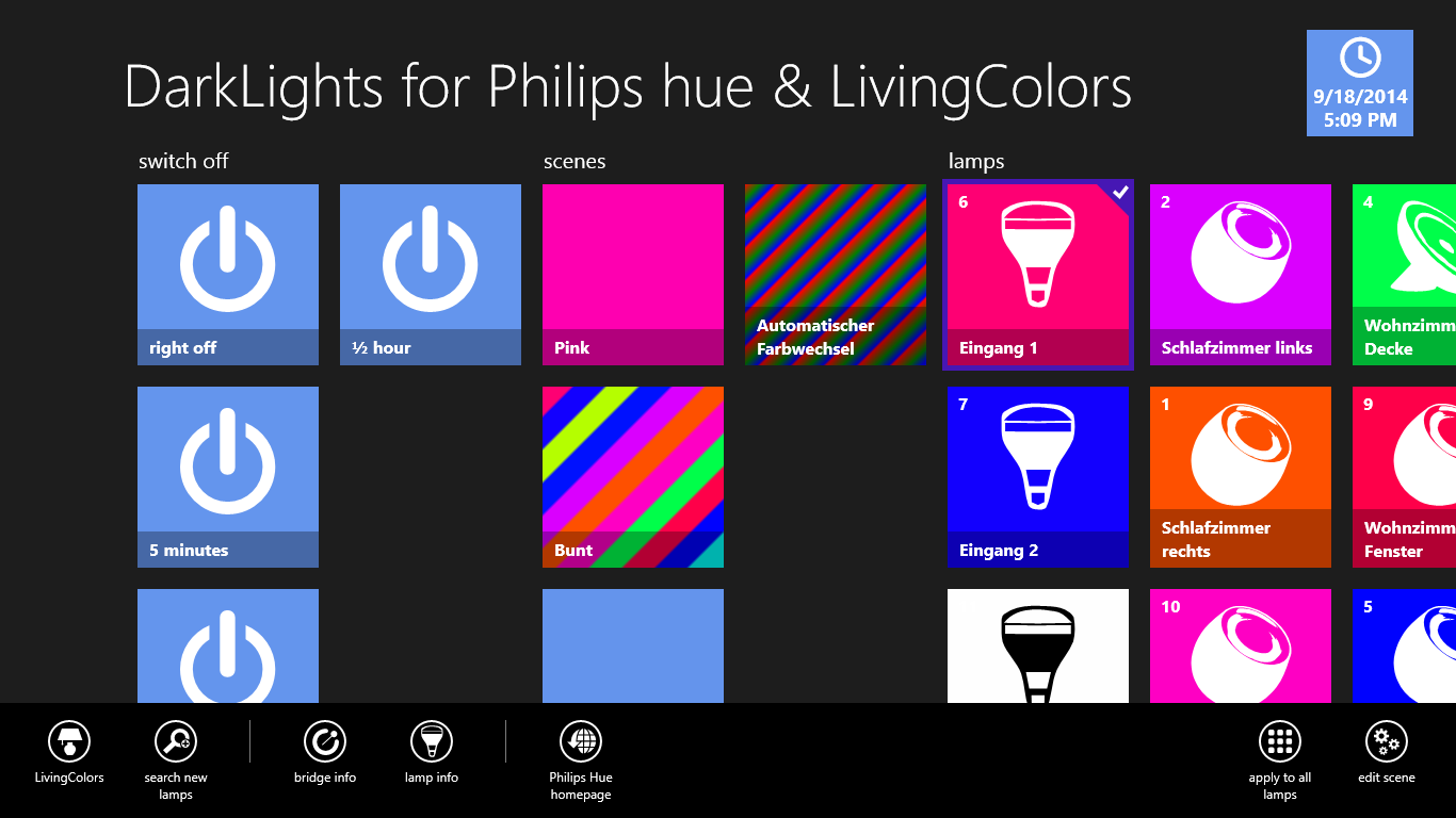 Prepared scenes quickly turn the lights on or off and selects the desired colors or automatic color change. The scenes themselves allows detailed control of each lamp. Strong colors, a gentle aura or an automatic color change is possible. And at the end of the day, let the sleep timer the lights automatically turn off.
