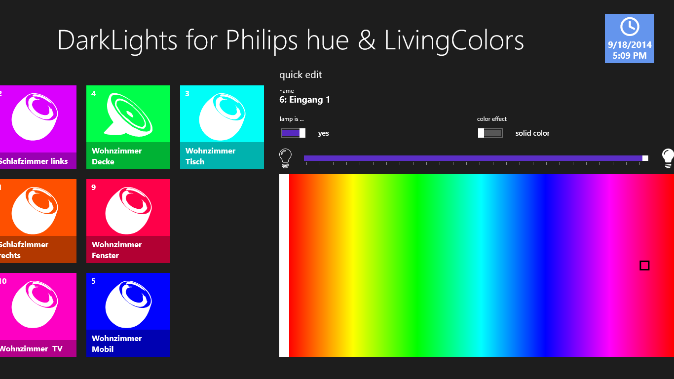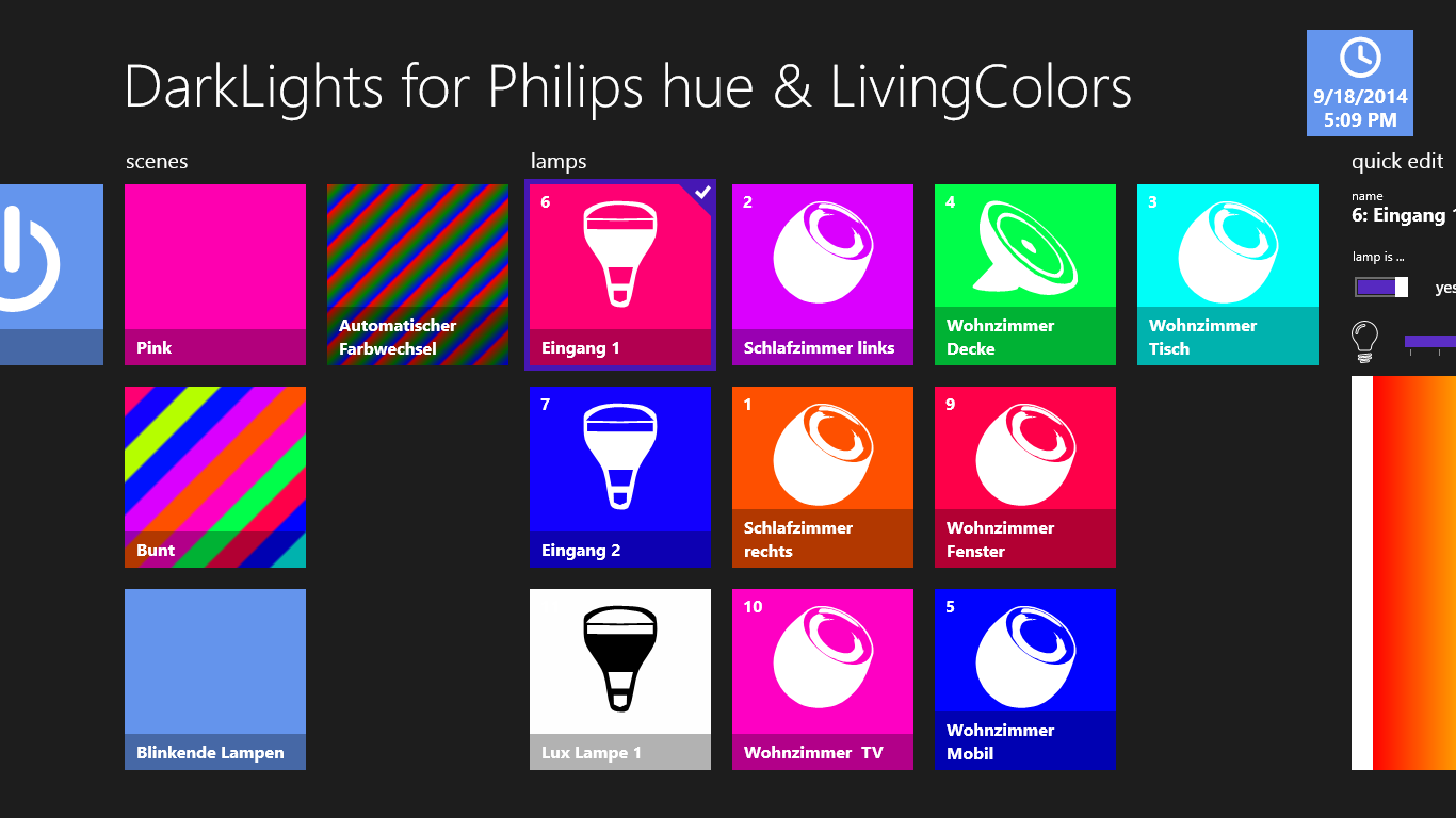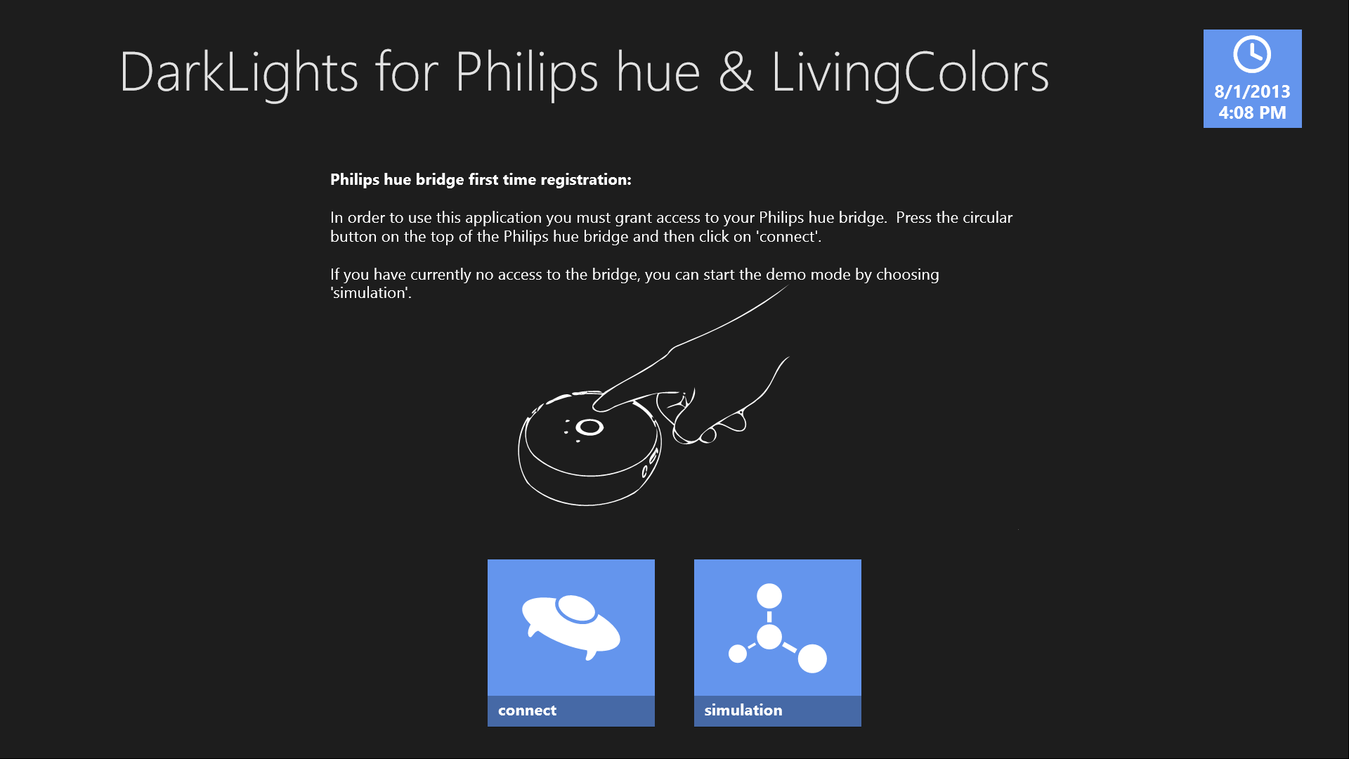 With DarkLights you connect to a Philips hue bridge and control your hue, lux and LivingColors lamps in a very simple manner.