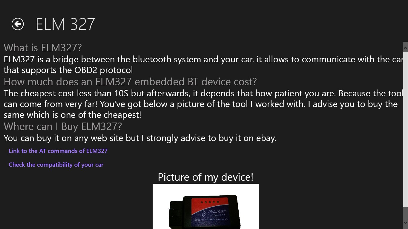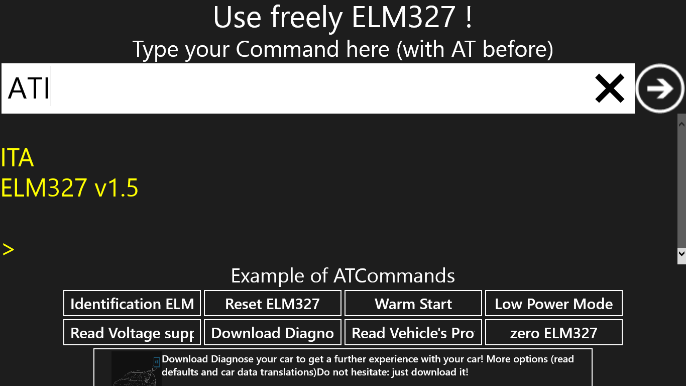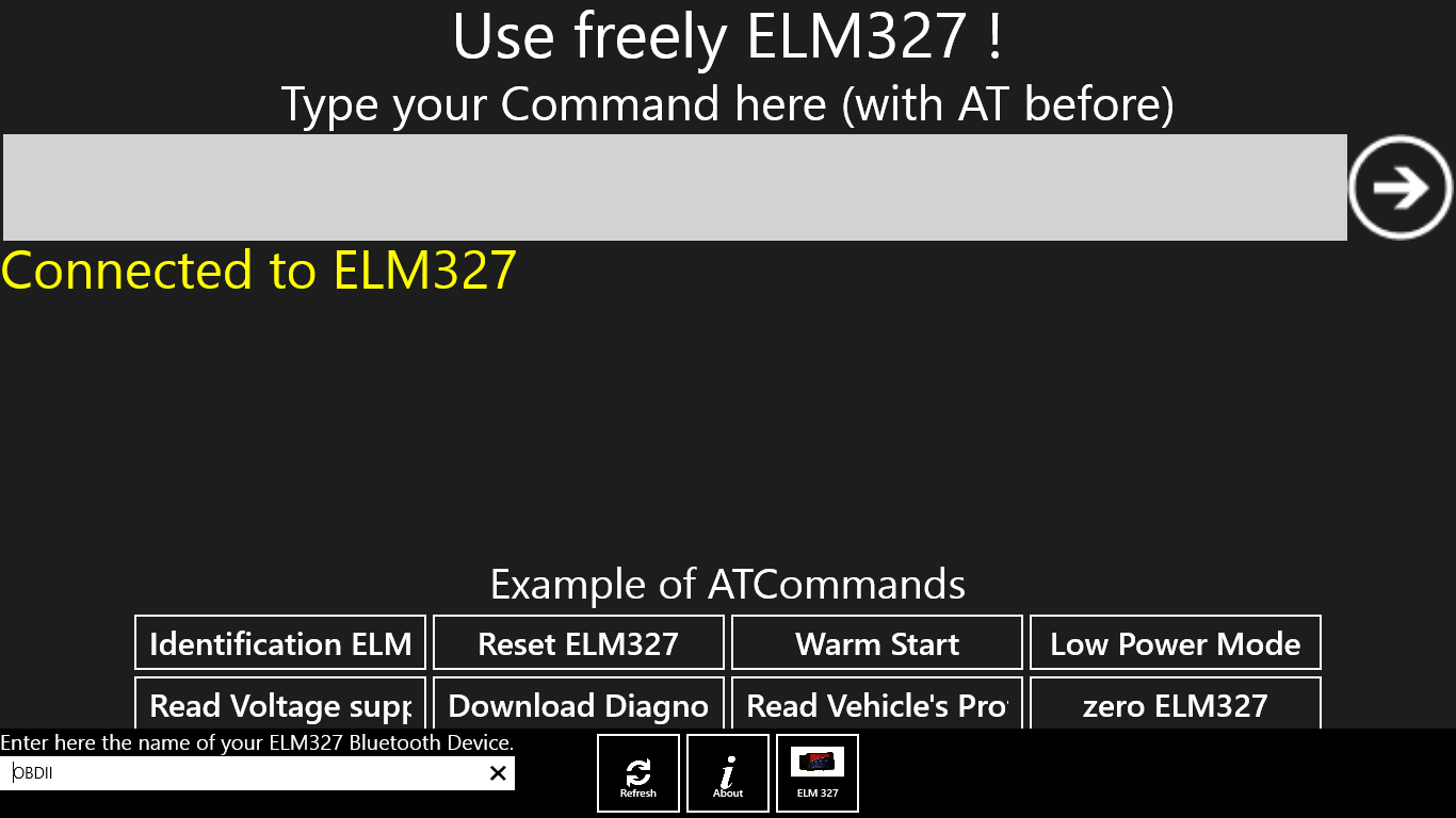 Use freely ELM327 the first Windows application of this type! With this App use your ELM327 as you wish What is ELM327? It is a diagnostic interface that allows to communicate with vehicle responding to OBDII Protocol. Thank to this application and ELM237 data sheet ( You can find it here: http://elmelectronics.com/DSheets/ELM327DS.pdf) you will be able be able to read a lot of information about you car such as read defaults. Do not use this application while driving. CeriBoo will not be responsible in case of car damages. This app is like diagnose your app. but with this app feel free to communicate with your car and your ELM327 tool as you wish! No translation of the data sent by the tool.