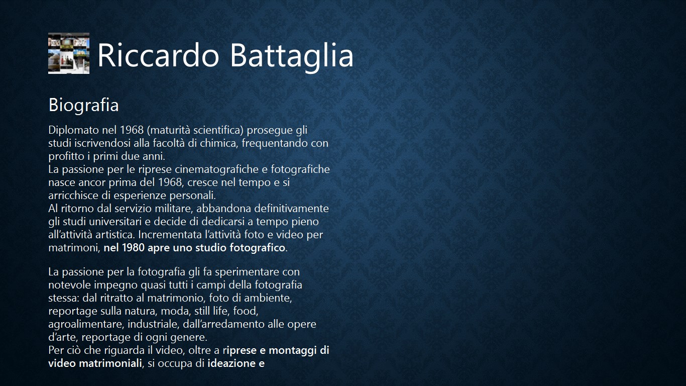 L'app Riccardo Battaglia vuole rendere omaggio alla professionalità del noto fotografo di Andria. Si potranno consultare i suoi lavori, i video matrimoniali e ogni sua attività proposta nei social network.