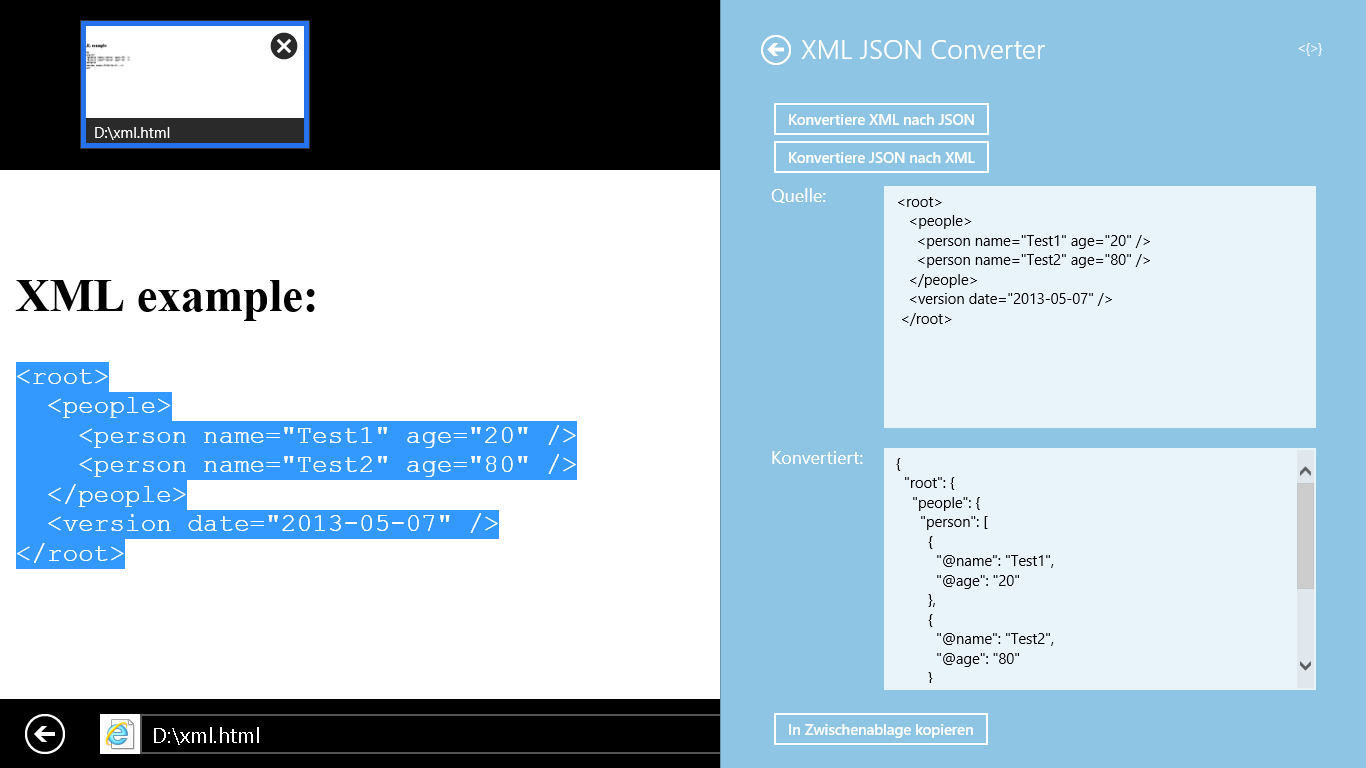 Konvertieren Sie XML nach JSON und umgekehrt! Fügen Sie einfach den XML- oder JSON-Code zur sofortigen Umwandlung ein. Oder teilen Sie aus einer anderen App Texte oder Dateien an XML JSON Converter, um sie ohne die laufende App zu verlassen zu konvertieren.