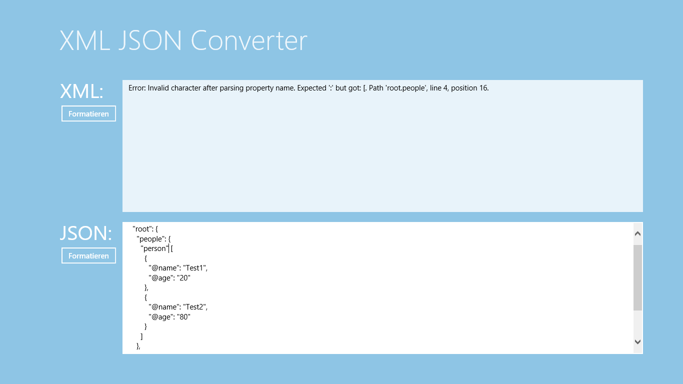 Außerdem kann XML JSON Converter Ihren Code zur besseren Lesbarkeit korrekt einrücken und Ihnen Fehlerinformationen anzeigen, falls Ihr Code fehlerhaft ist.