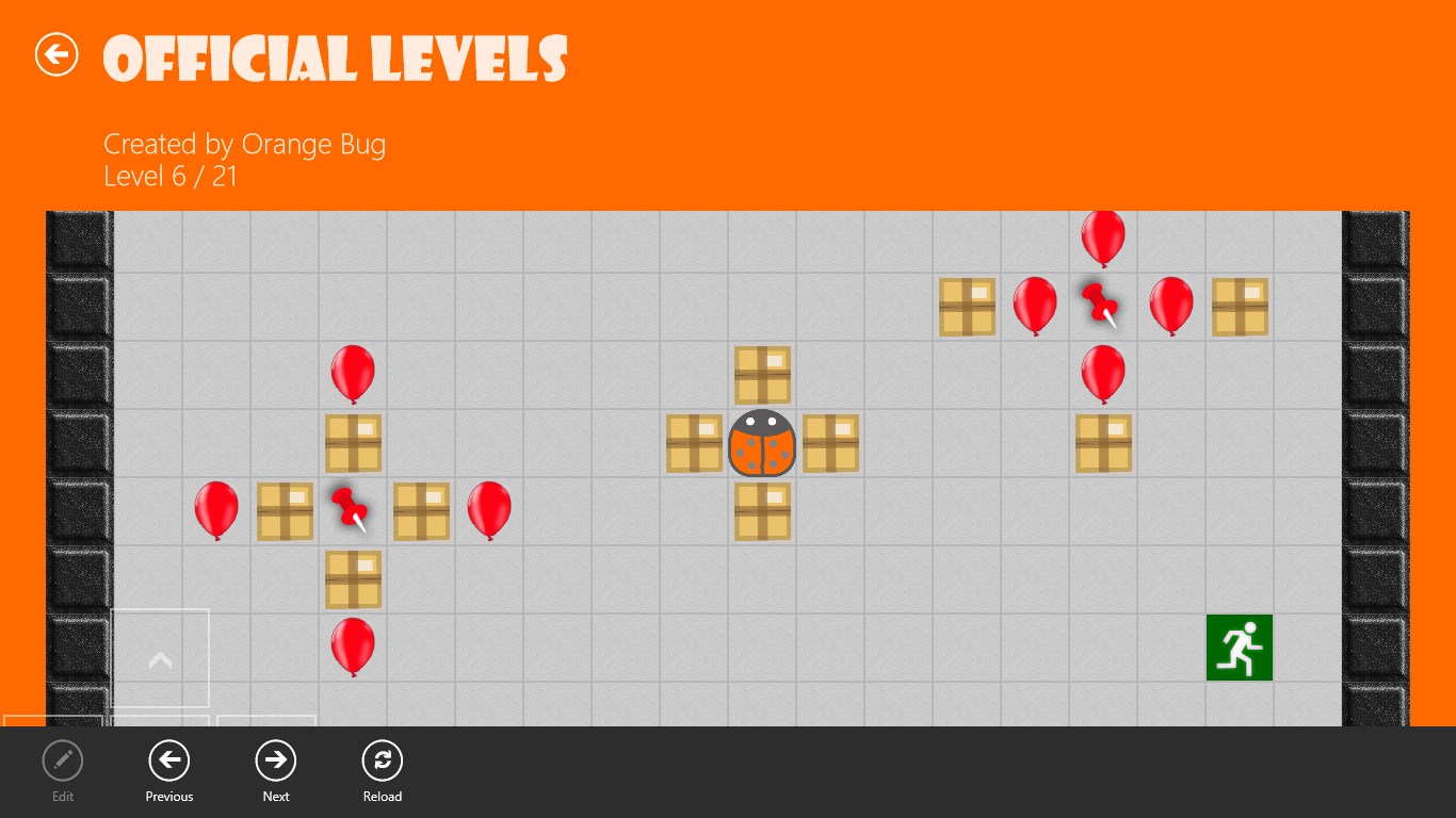 Like playing Sokoban or Pushy? Welcome to Orange Bug! Orange Bug is a puzzle game where you push around crates and balloons. To solve the puzzle pop the balloons and find your way to the exit. But be careful: One false move and the level is unsolvable and you have to start over.
