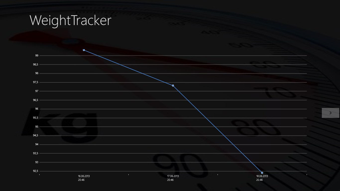 This app allows you to track your weight. Simple add your current weight and the data will be stored in the app. You can see it in a graph and also in a list where you can simply remove entries. So let's start to track your weight.