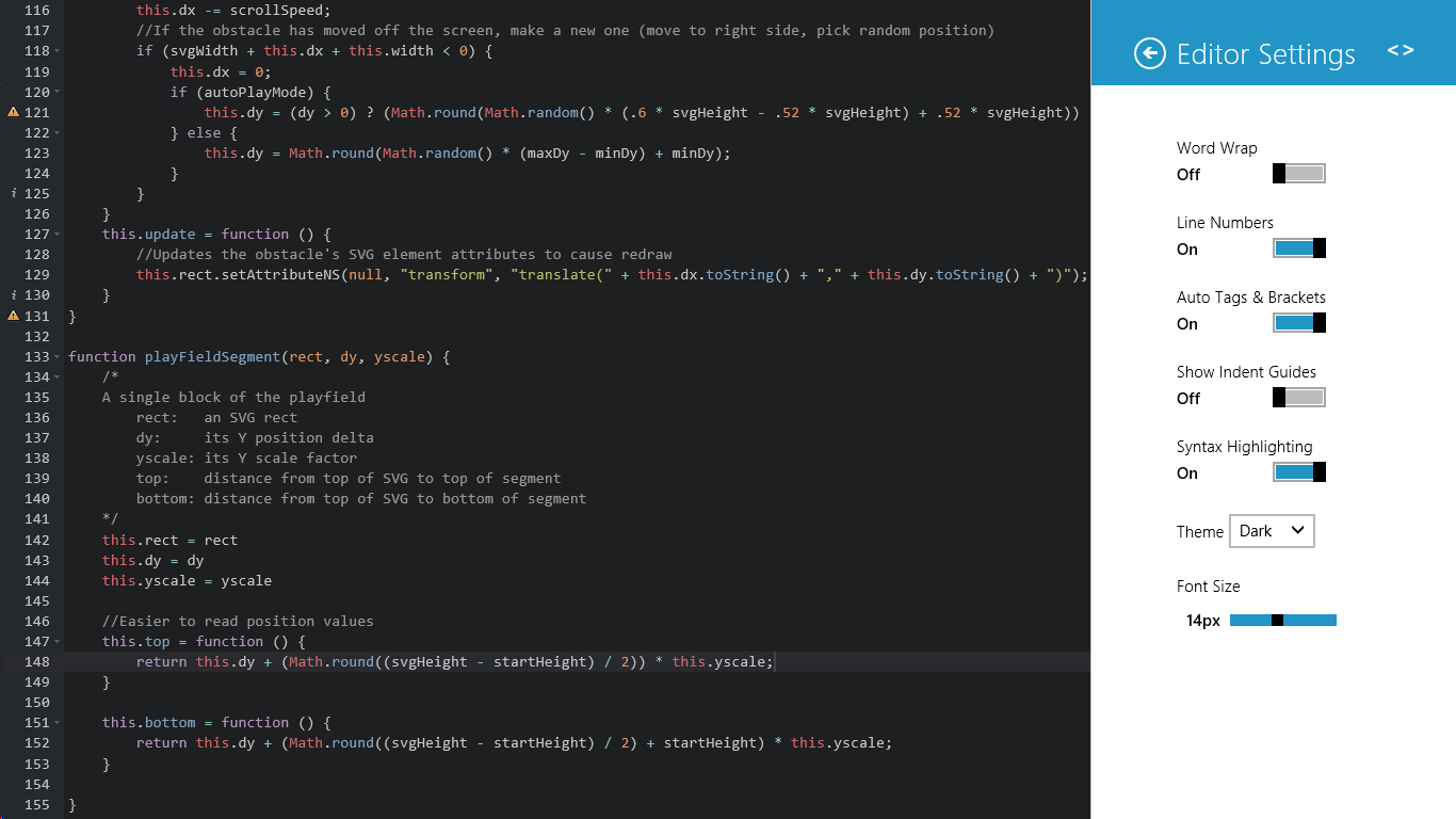 Automatic syntax highlighting in over 40 programming languages like JS, HTML, CSS, C++, C#, PHP, Python, and moreLight and Dark themesAutomatic closing and matching of tags, braces, brackets, and parenthesesTabbed browsing with unlimited filesLaunch files in other apps, like a web browser, straight from the editorSnap side by side with other apps, like a web browserTouch support: tap to place the caret, hold to select, and swipe to panOptimized even for the longest of source files