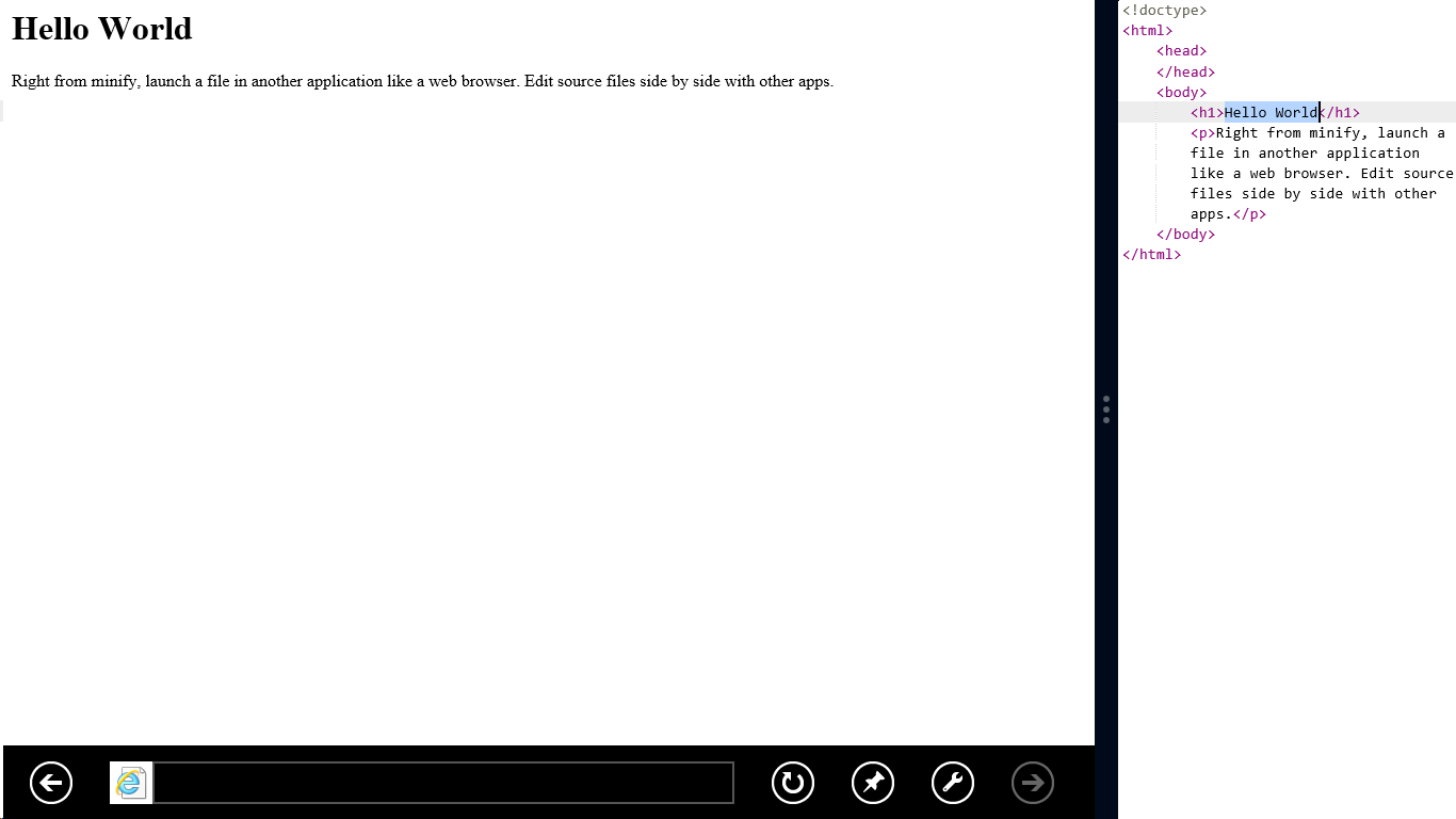 The touch-friendly editor for programmers. Supports automatic syntax highlighting, smart closing of tags and braces, light and dark themes, and a number of other configurable settings. Whether editing files on your desktop or on the go with your tablet, Minify is a powerful and fast source code editor that has everything you need from undo/redo and find/replace to auto-indentation and code folding. Try it out free for 15 days! Now with improved support for Windows 8.1.