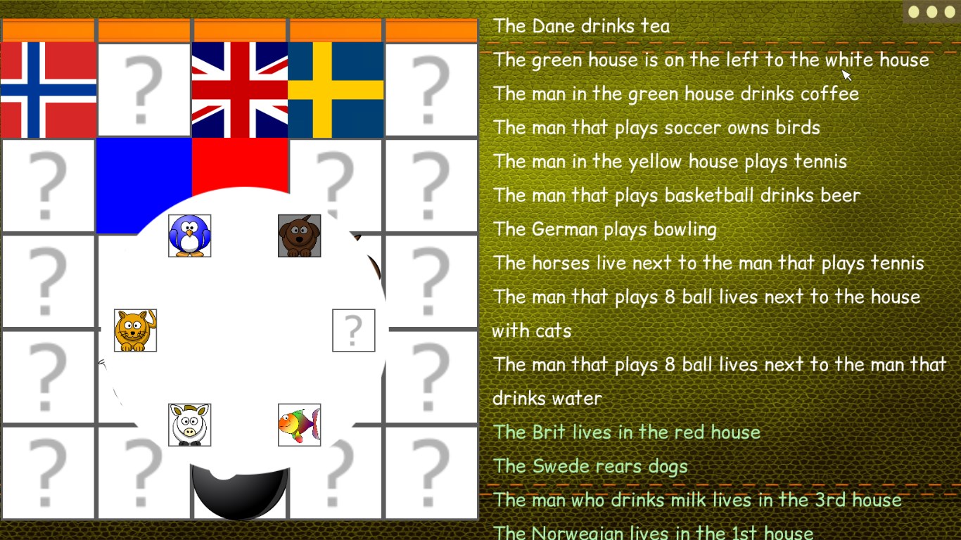 This application provides an easier way to solve the puzzle. It presents the rules and the board side by side and allows you to easily make selections. It highlights red or green a rule automatically, when it is violated or fulfilled. It also offers easier variations, with fewer houses and properties. The variation presented above is the first one of the 5x5 puzzles. If you solve it and are eager for more, you can find many puzzles with similar difficulty in the '5x5' category.