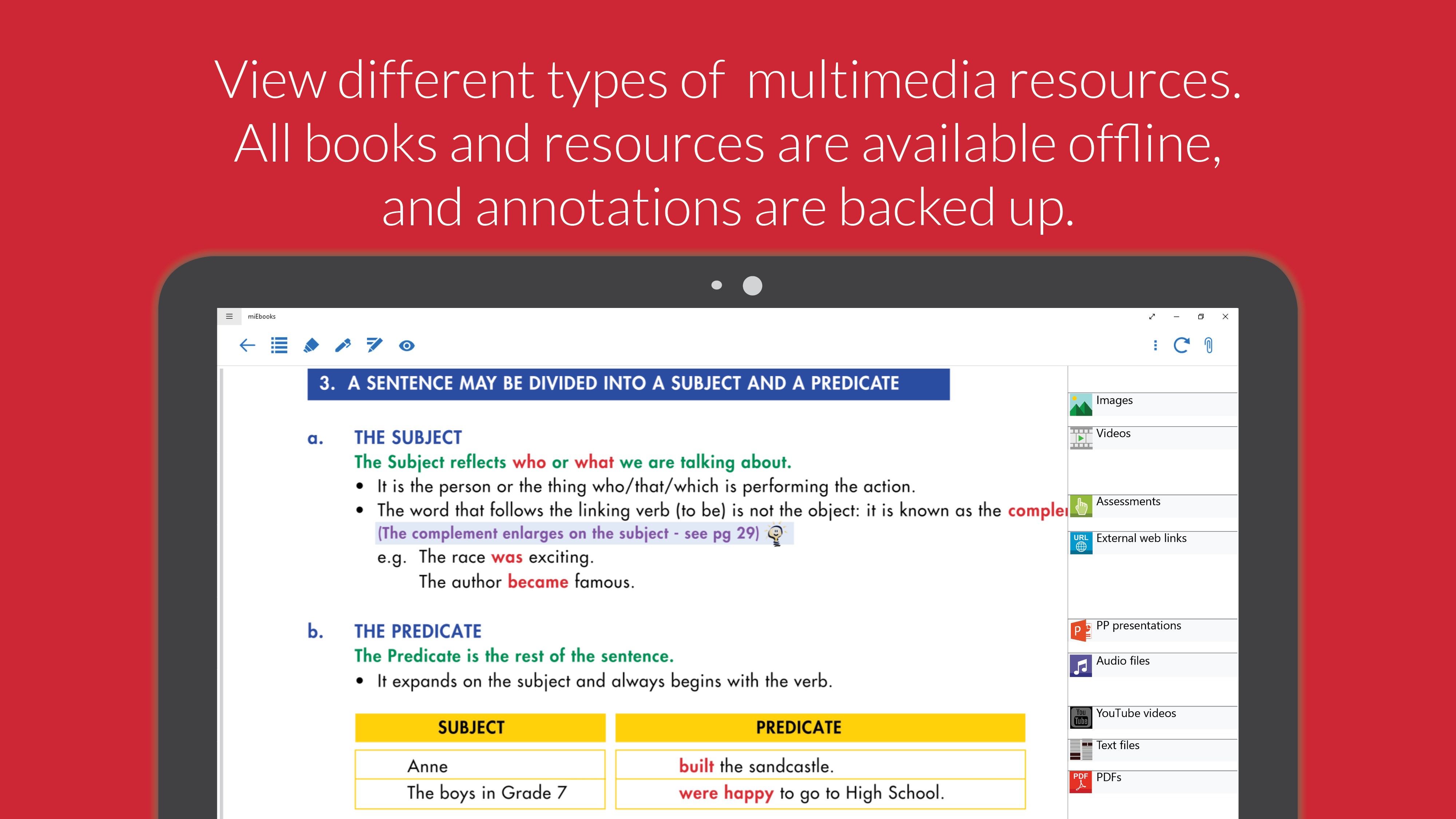 miEbooks, developed by ITSI, is an interactive e-reader that enhances users’ reading and studying experience. The app enables users to add notes and sketches to specific sections of an e-book, make highlights, generate summaries from highlighted text for study purposes, receive additional multimedia resources, and more. Once downloaded, all books and resources are available offline and annotations are backed-up whenever users connect to the Internet or Wi-Fi within their institution.