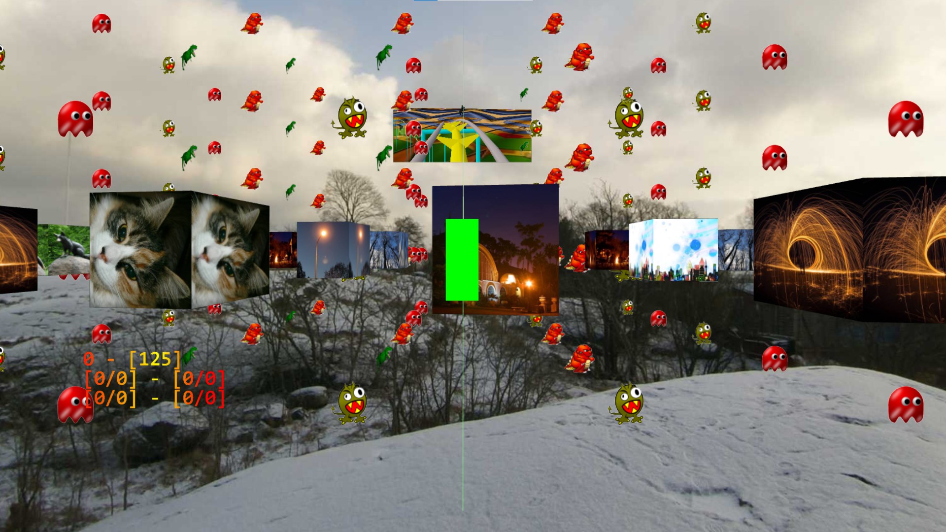 - "Same Game": a puzzle game with blocks of same color to remove.- Pong Game": a video game with intermediate enemies to destroy.- "Shooter Game": an isometric shooter to free the animals (green cages) and not the monsters or the dragons (red cages).- Prepare background images, filter images, add 3D objects to images.- Adding a labyrinth (Maze) increasingly difficult between games ("Same Game").