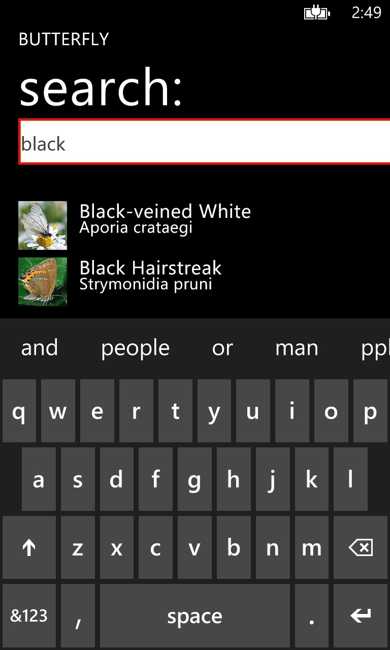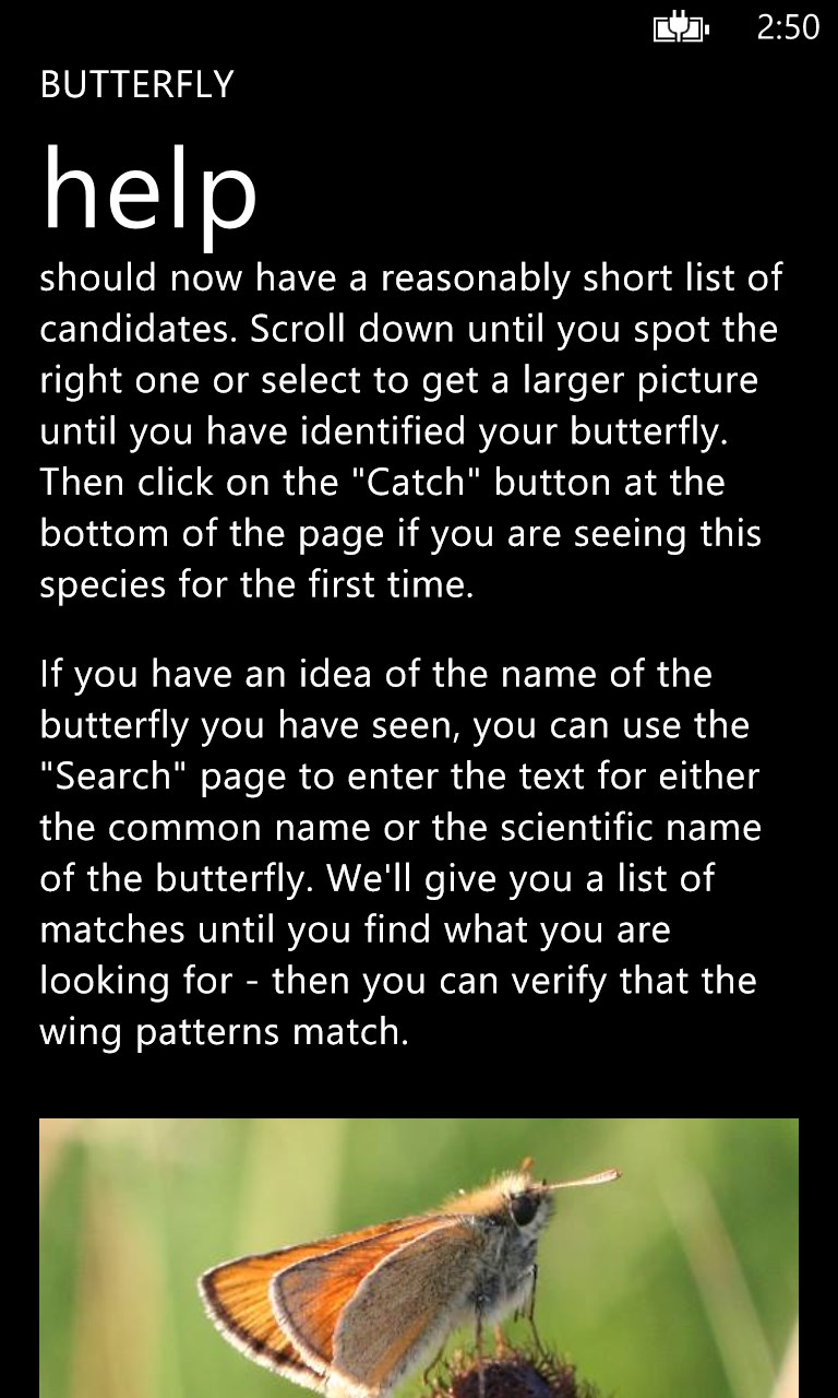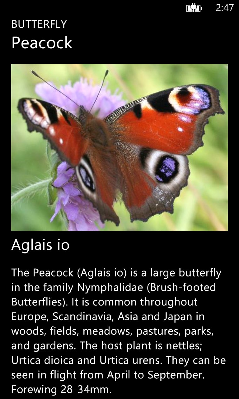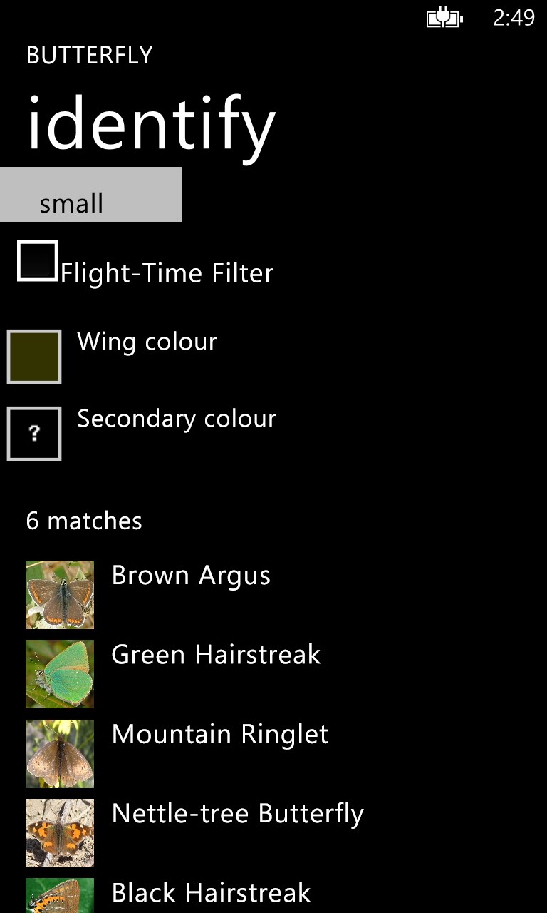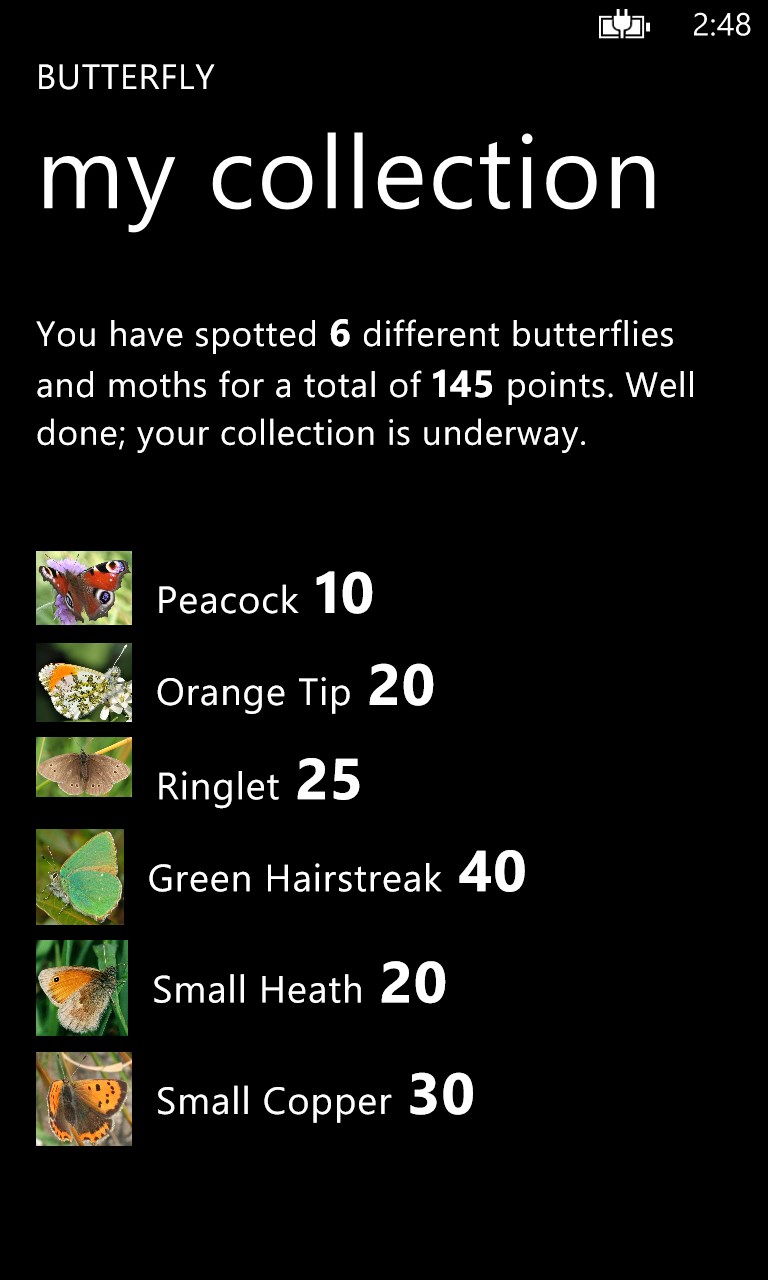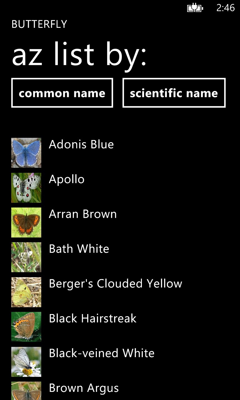 The next time you see a butterfly you don't recognize, reach for your pocket and find it using your phone. You can flip through a list of common butterflies and day-flying moths in Britain and Europe, search by name, or filter your search by colour, time of year and size. No need to wait until you get home to search through a field guide while trying to remember what it looked like! When you've identified your butterfly you can add it to your "collection" (don't worry - no butterflies will be harmed), and we'll automatically record the time and location of your sighting. And just to make it even more fun for kids and adults alike, you can score points depending on how rare the sighting. The application is ad-free and does not require a data connection, so it will continue to work in the field. It's like having a Lepidopterist in your pocket!