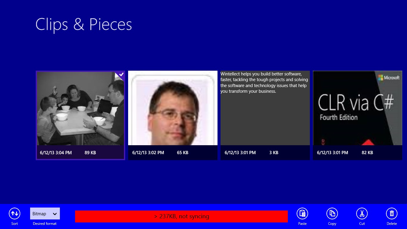 Clips & Pieces allows you to capture several items from your clipboard in to a repository for retrieval at a later time. Then, in the future, you can copy them from Clip & Pieces back into the clipboard so you can paste them into other apps . In addition, items you put in Clips & Pieces roam to all your PCs so you can copy from one PC and paste on another PC. Clips & Pieces supports Windows Share so you can put clips into it from other apps and share selected items from Clips & Pieces with other apps.