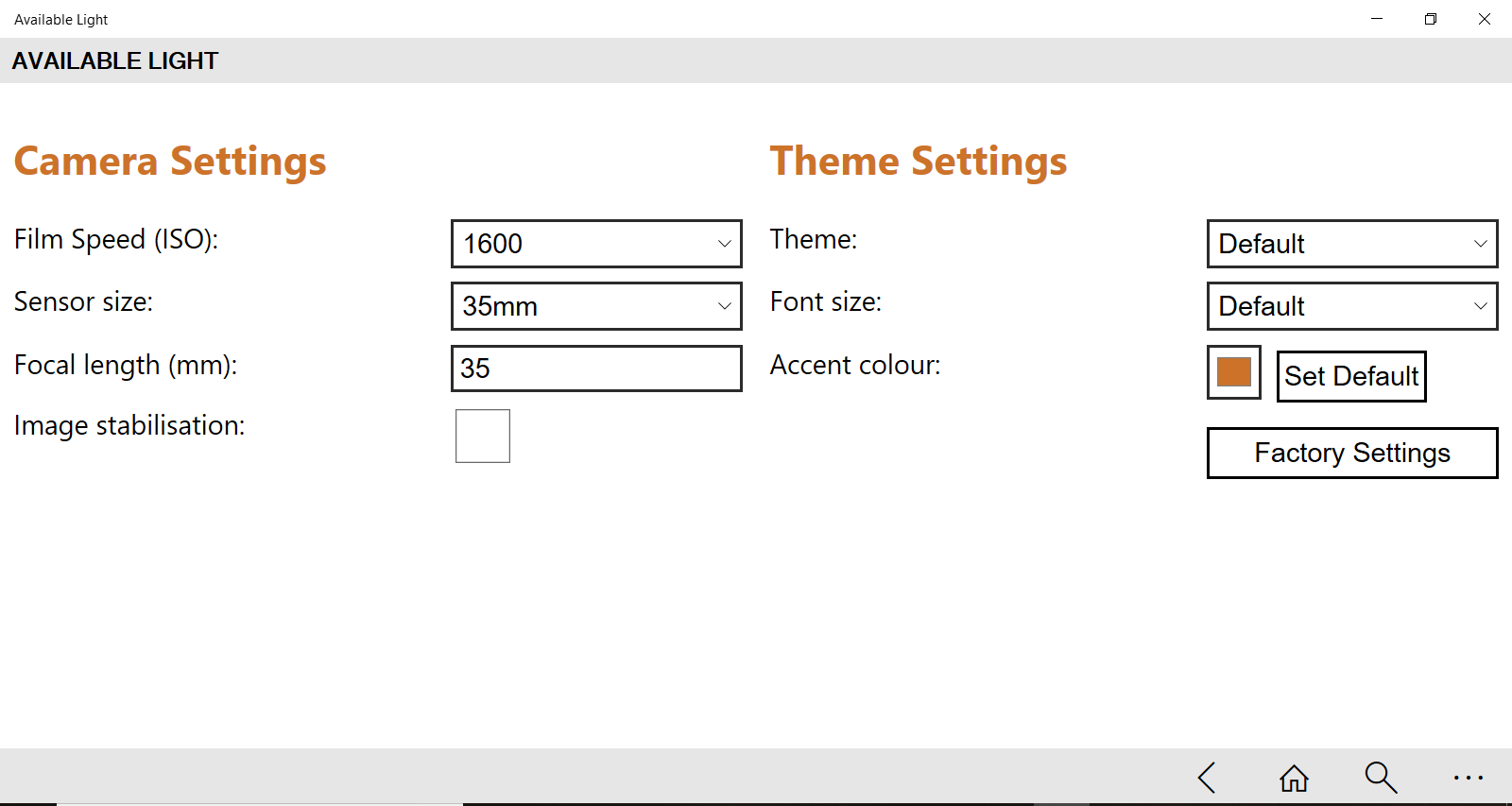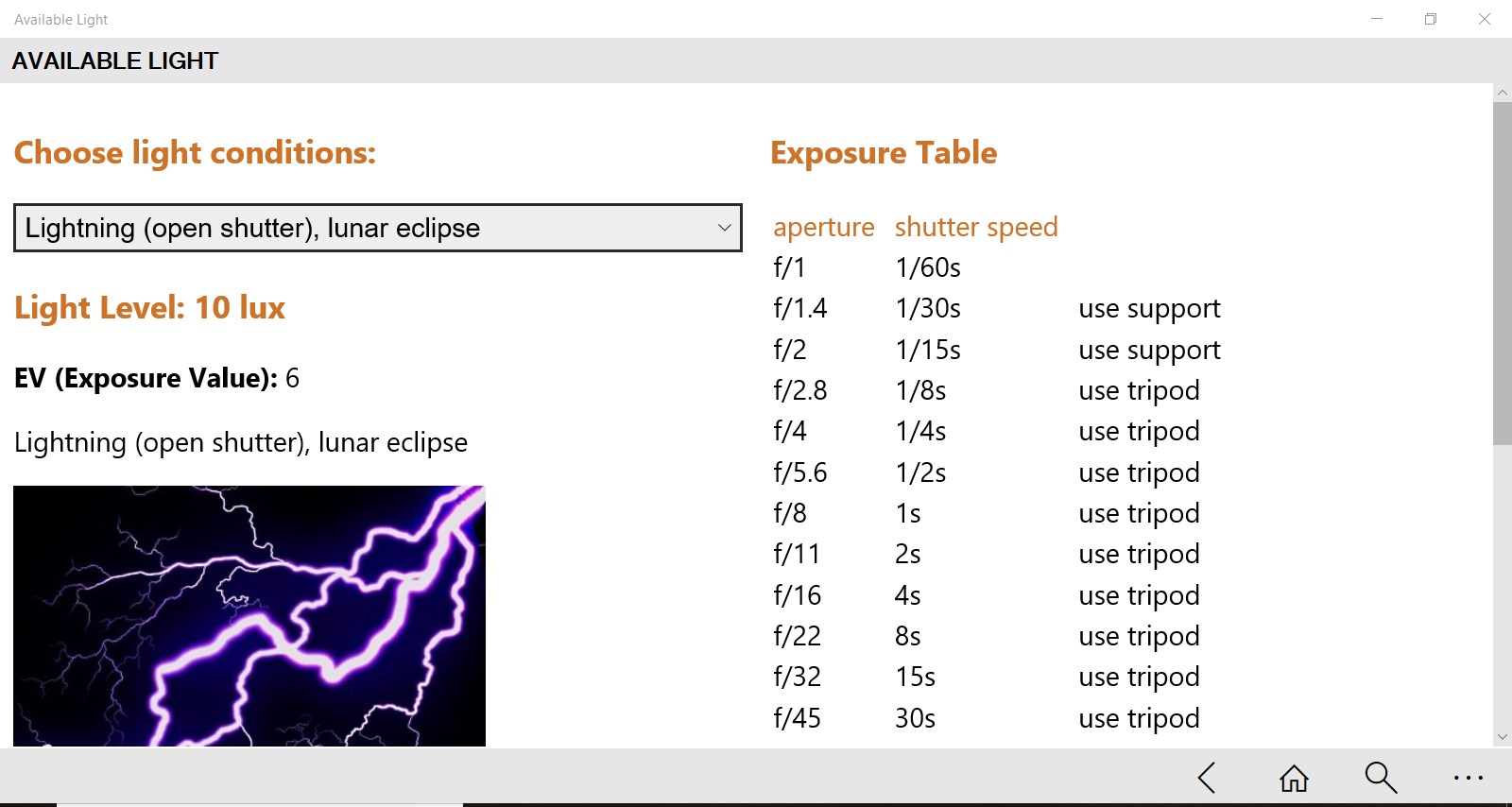 Modern cameras have great built-in light meters, but sometimes taking photographs using available light (i.e. without flash or other photographic lighting) can be a challenge, especially with long exposures in low light levels or very high intensity lighting. Fortunately in extreme conditions you can usually use an exposure guide like this one. Simply enter your film speed setting, choose the lighting conditions from the list and then see a table of shutter speed and aperture combinations. This table allows you to use a camera with manual control in conditions outside the range of the built-in light meter. The app will also compute the Exposure Value and light level in lux. It's a simple tool to help you take good photographs in difficult conditions.