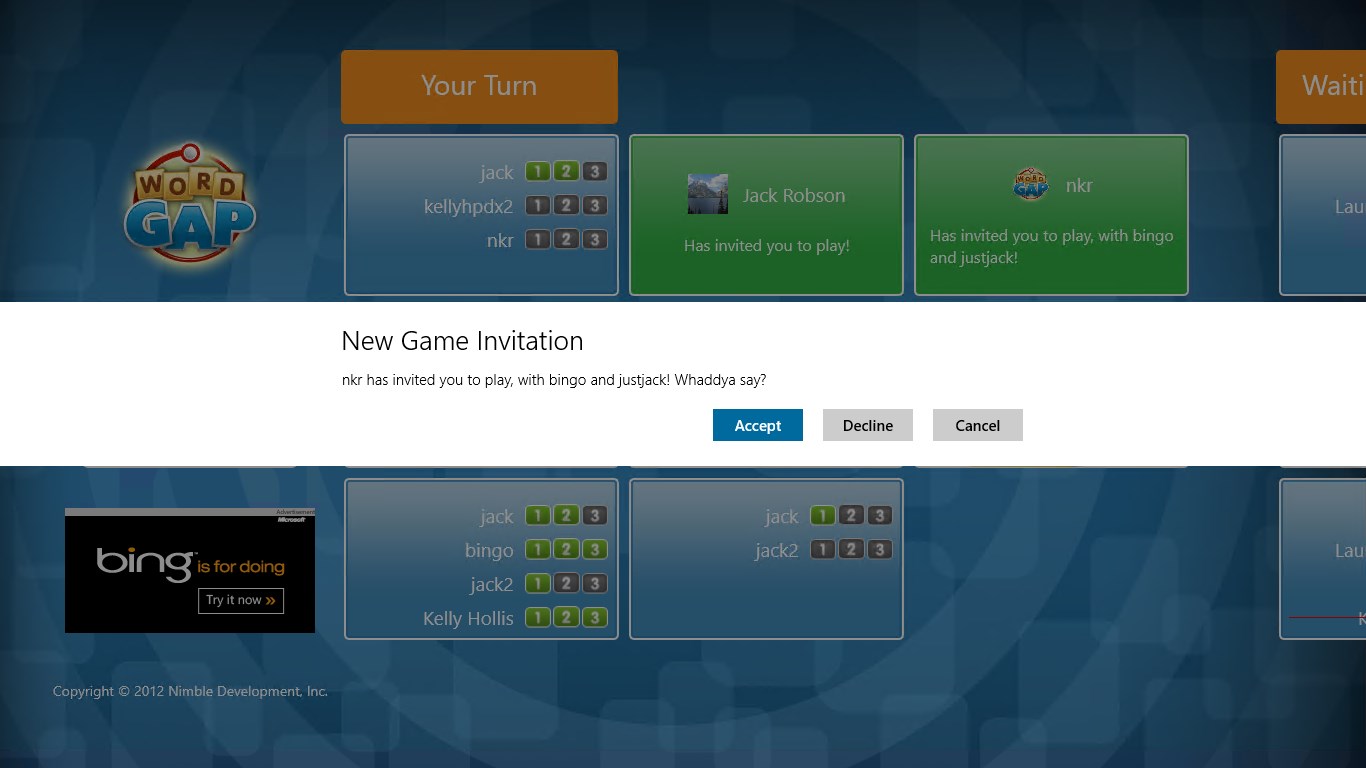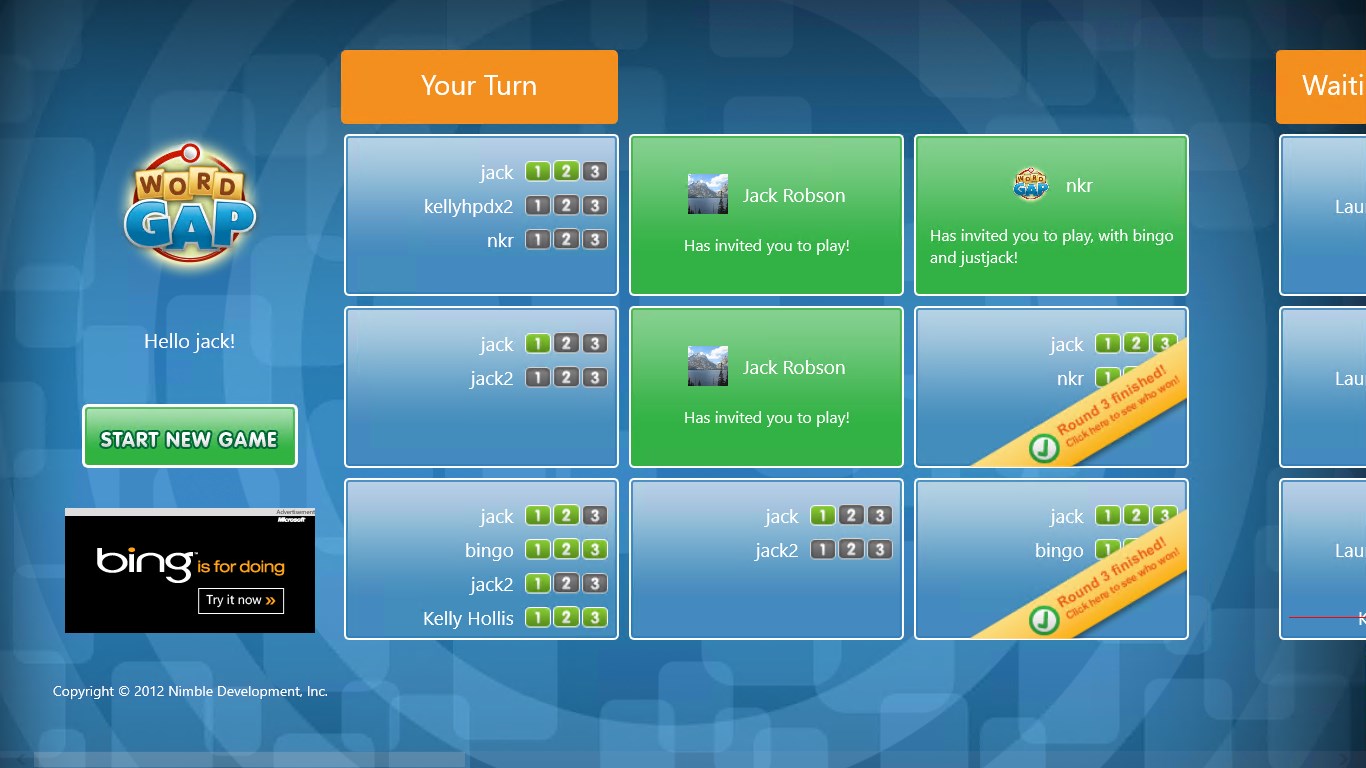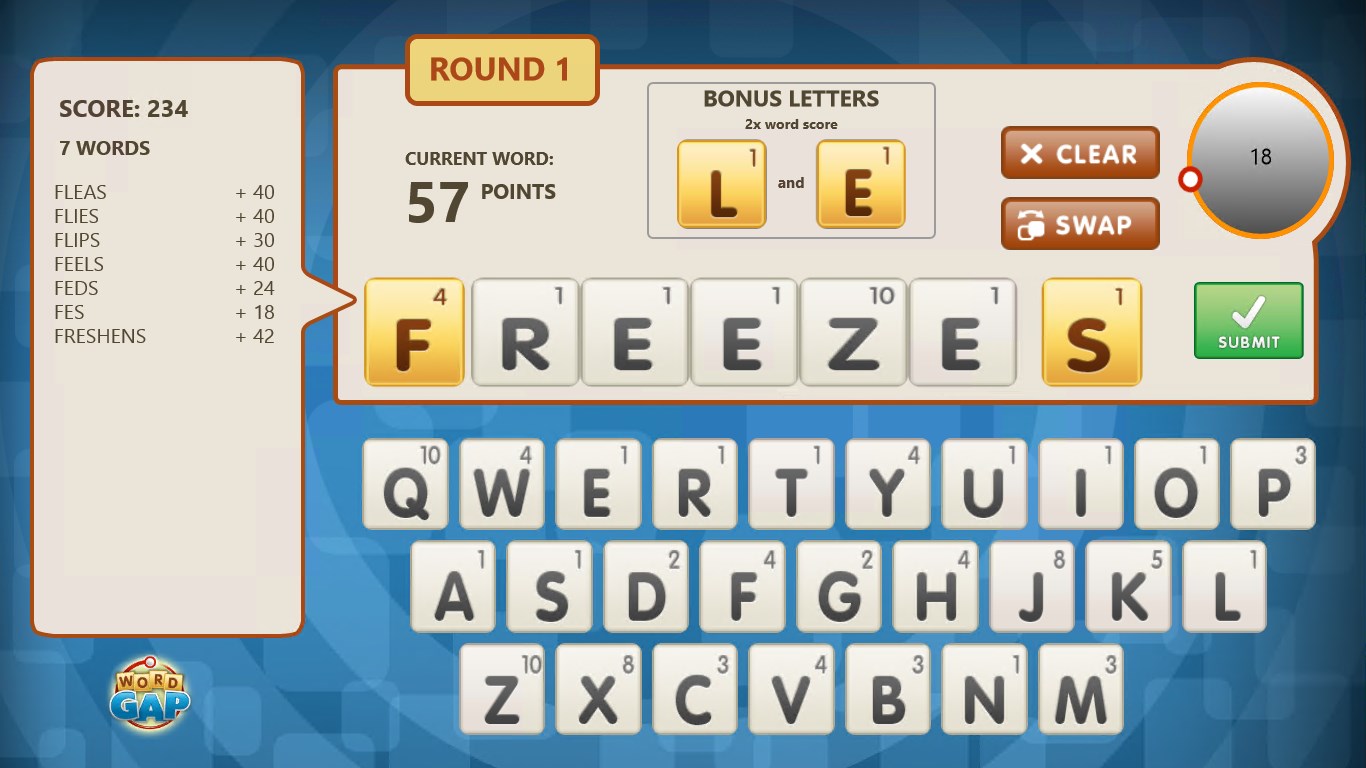 WordGap is a fast-paced touch-friendly word game. Play by yourself or challenge up to three other players. Each game consists of three rounds of play where you are presented with two letters. Your challenge is to form as many words as you can think of that begin and end with those two letters. Each round also contains two bonus letters. You score will be much higher if you use one or both of those bonus letters in a word. And, much like life, time is precious! You only have one minute per round.