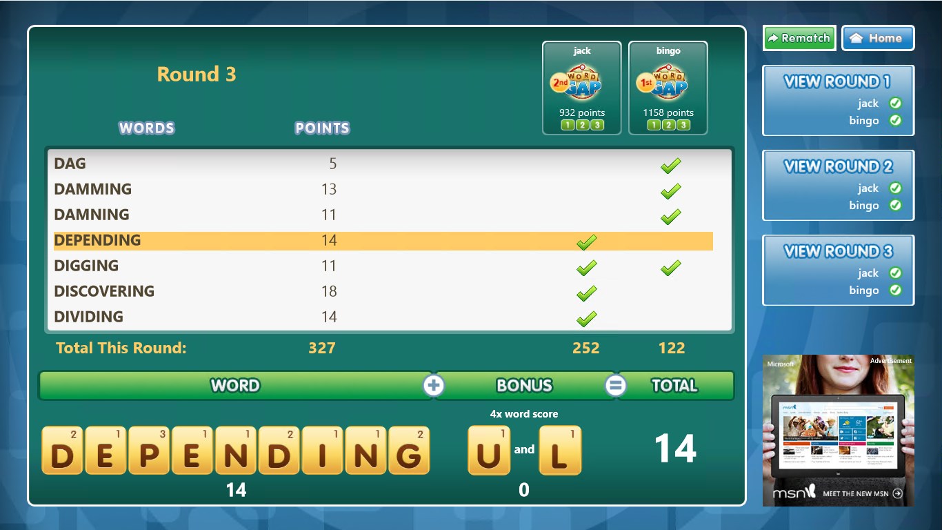 Play solo or with 1-3 online friendsSurface tablet friendly - works great on Surface RTMatch up against your Live and Facebook friendsHone your vocabulary and spelling with thousands of possible round lettersletter multipliers increase each round, so a great third round can win it all!Supports touch or mouse/keyboardBonus