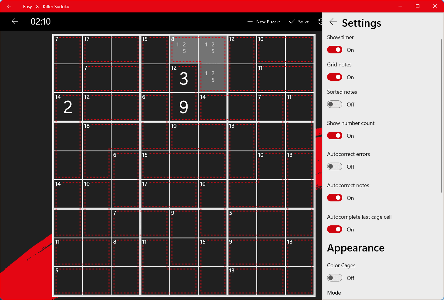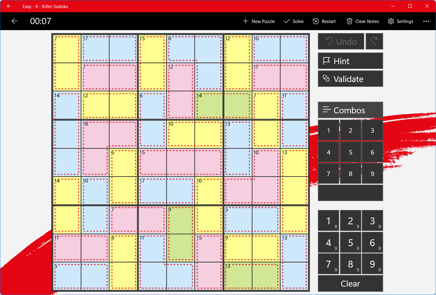 Solving a Killer Sudoku puzzle requires a lot of notes, so we worked hard to make the note entry features in this app perfect. A dedicated note keypad and the ability to select multiple cells makes entering notes fast.