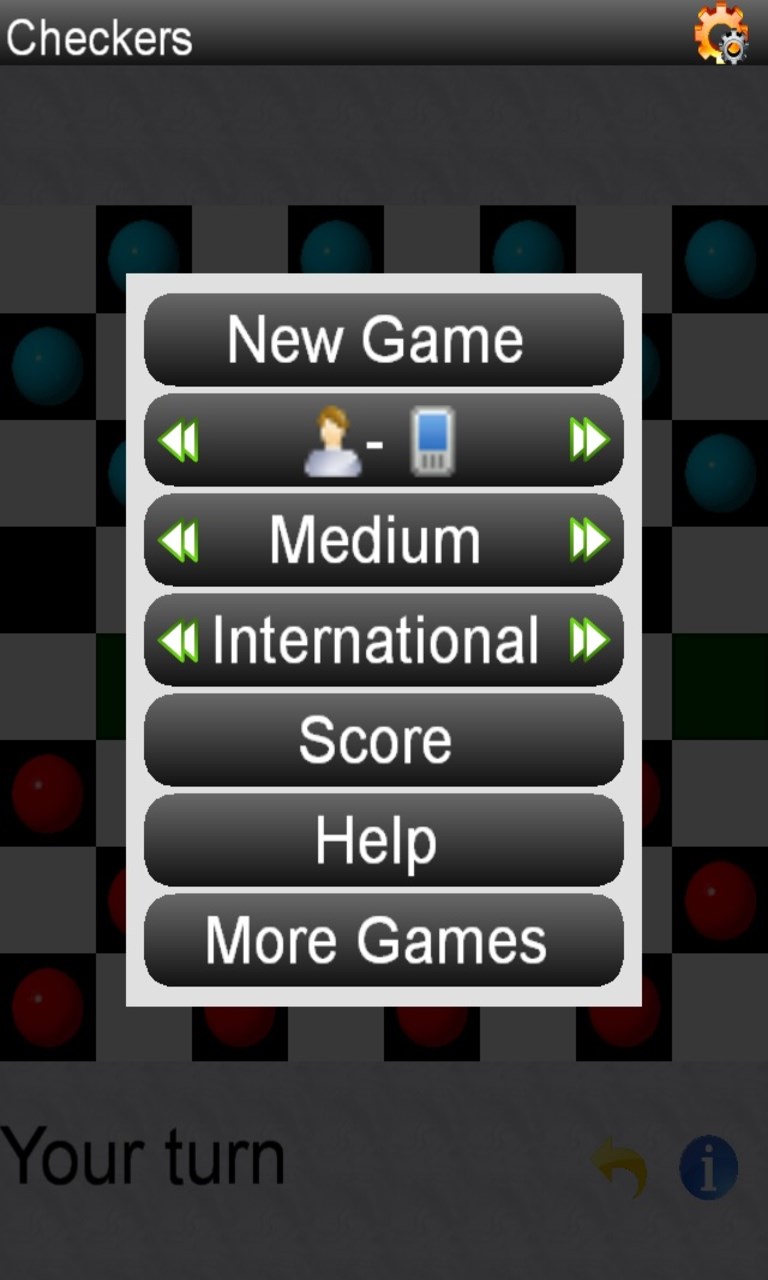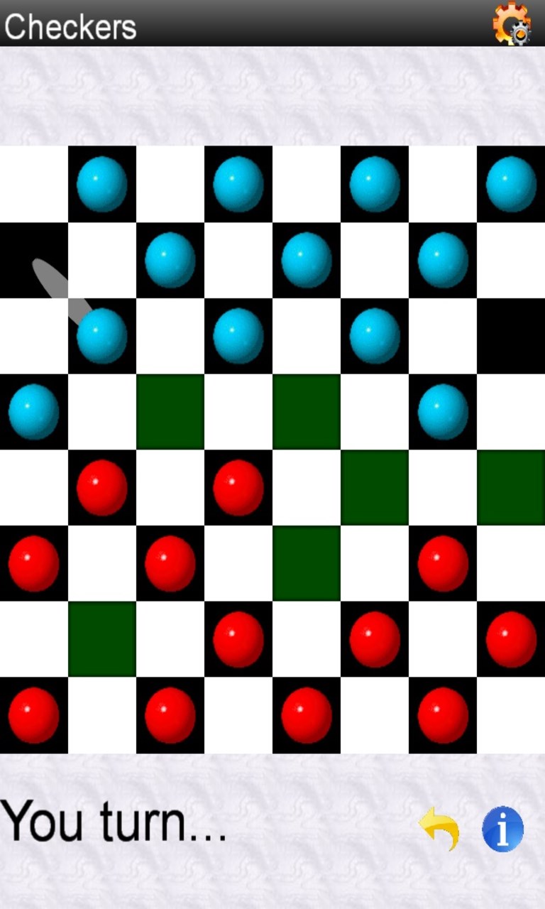 Checkers played by two opponents, on opposite sides of a board, alternating moves. In a single player mode, person is always down (blue) regardless of who is moving first. Pieces move diagonally on the dark squares and opponents' pieces are captured by jumping over them to an unoccupied square. Capturing is mandatory. When multiple capture sequence is available, player may choose the sequence but have to make all available captures. When men reach the farthest row forward, they become kings, enabling them to move backwards.