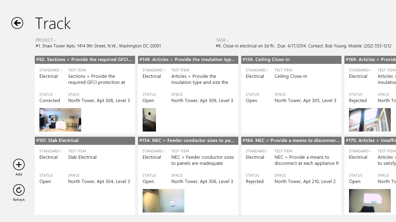 Track module: A general-purpose tool to capture the what, where, when, who, how much, photos, and free-form notes at the job site.Point module: All the power of the Track tool but optimized for punching—tap the spot on a floor plan to determine the precise location of a problem, choose the repair. Done.Zoom-to-room: Automatically fly to the right room on a floor plan.Assignments: Assign and sequence multiple subcontractors to perform tasks.Reports: Create reports that can be printed, E-mailed, or archived.Business intelligence: Explore live reports to improve your processes and find hidden risk.Workflows: Eliminate manual work to save time and money.