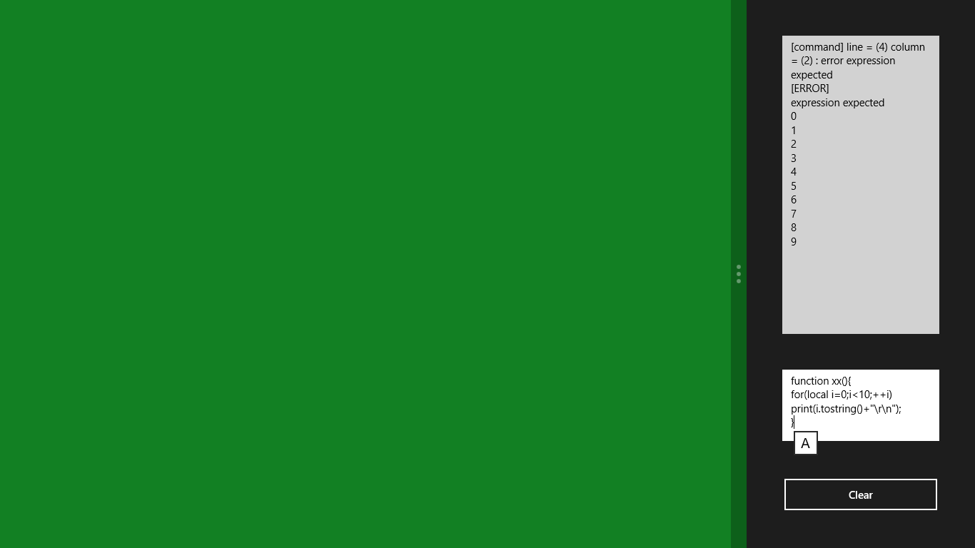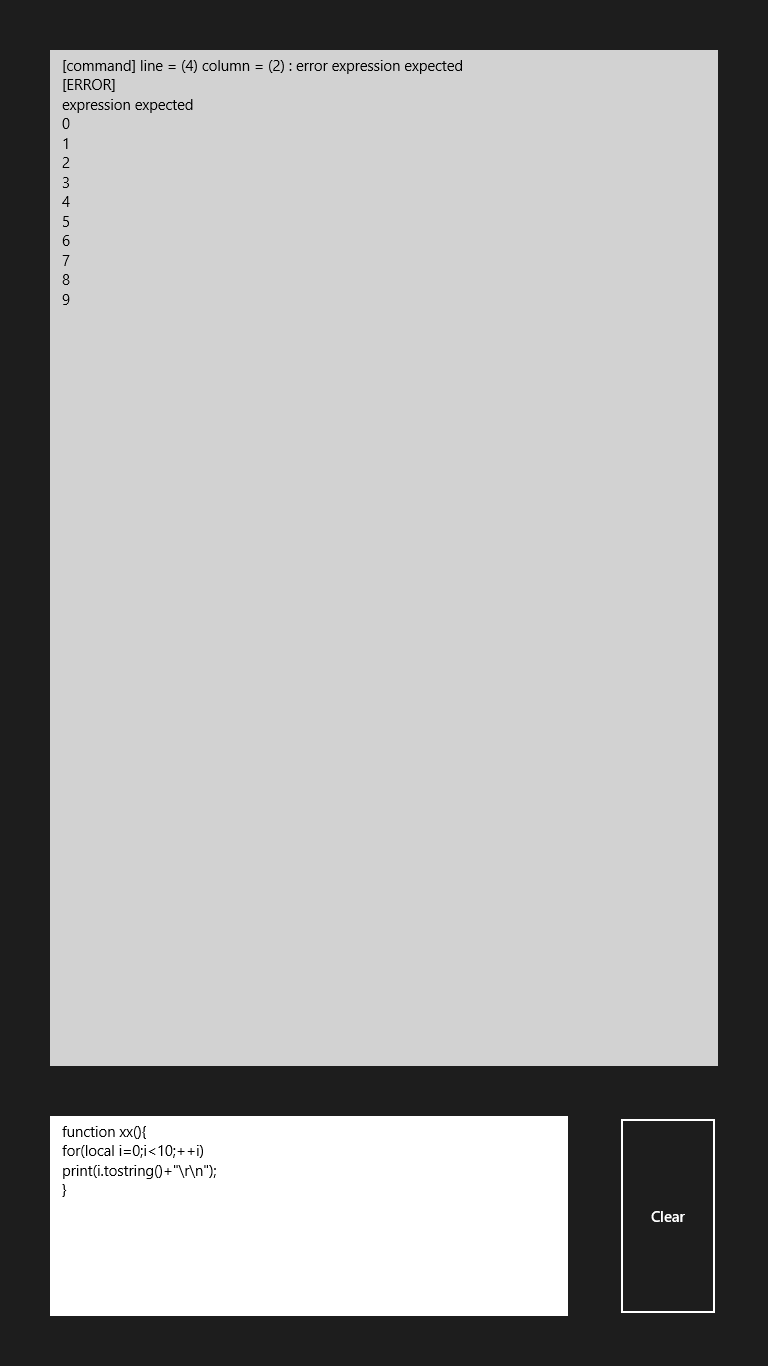You can try Squirrel script simply.This application provide Squirrel standard library.This application have volatile environment.