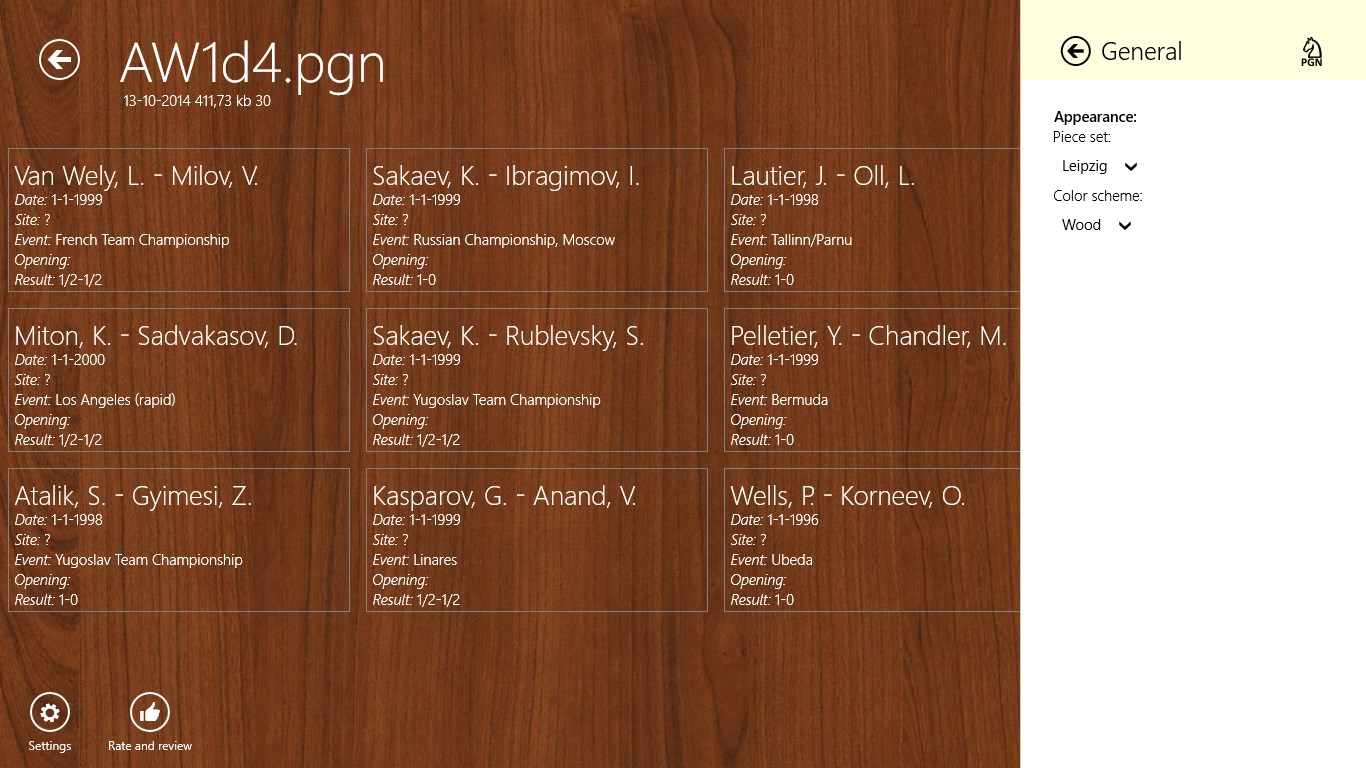 On the Internet you can find millions of free PGN files containing games of your favorite players. With PGNViewer you can browse and study through those games.