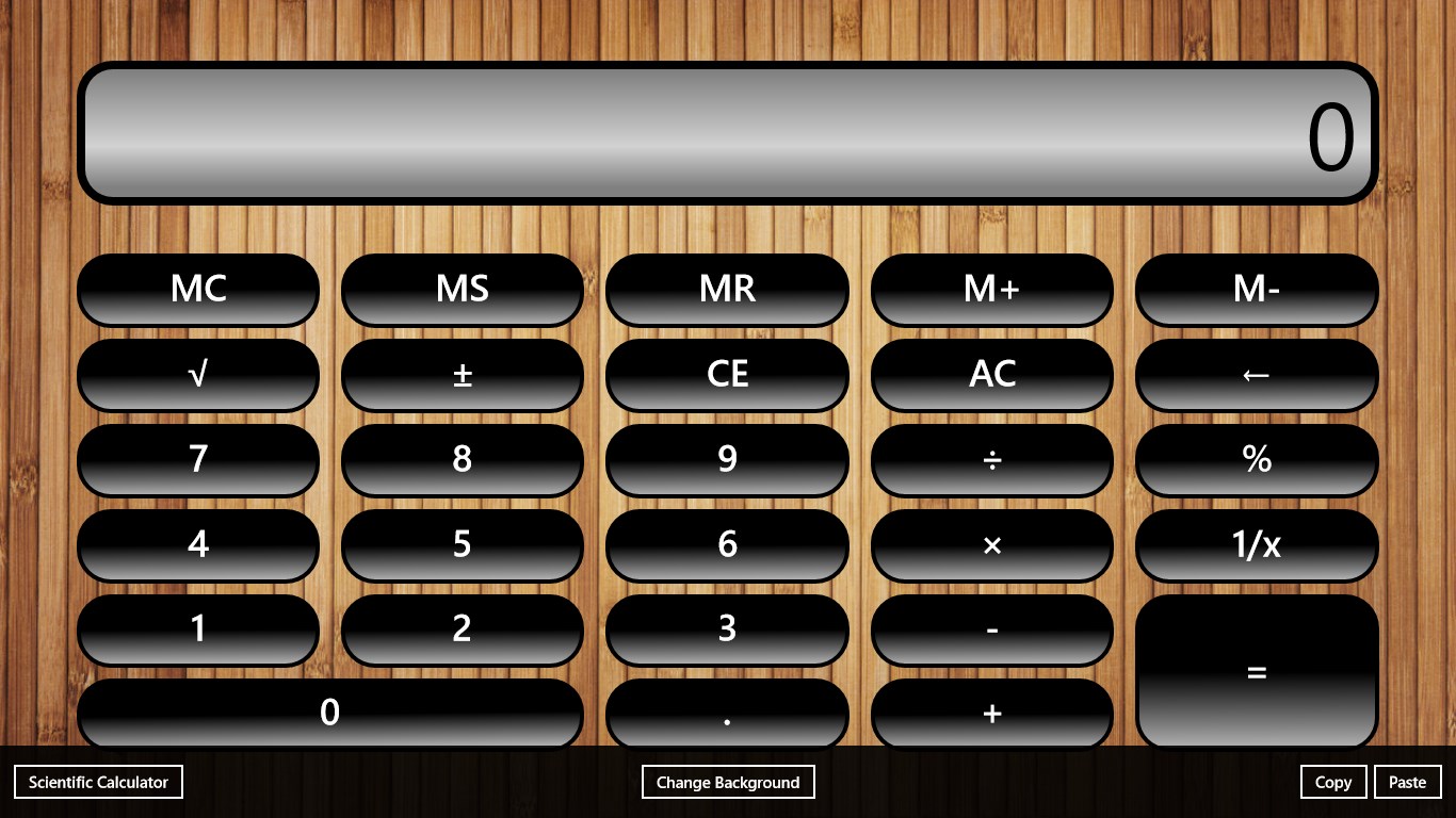 User can change between Standard and Scientific calculator mode using bottom app bar. Using same app bar they can change background and copy/paste,