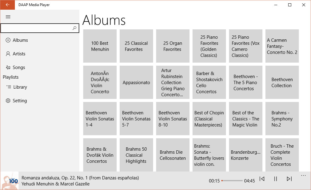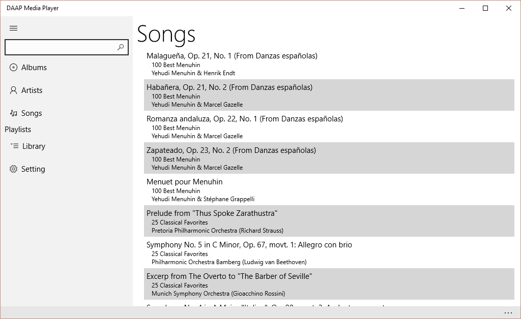 DAAP Media Player allows you to stream your music from a DAAP share such as mt-daapd (firefly), Rhythmbox, forked-daapd, tangerine, most NAS devices such as FreeNAS, QNAP servers, and older versions of iTunes.