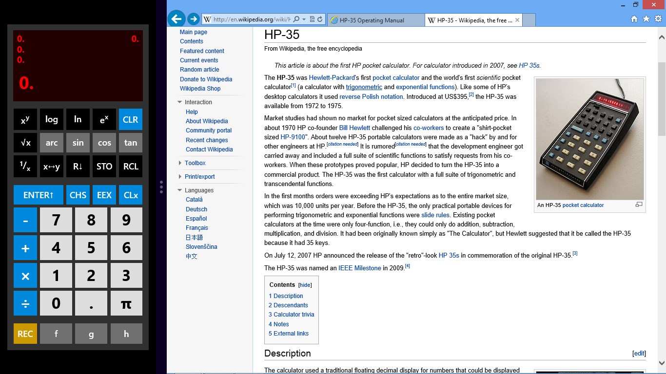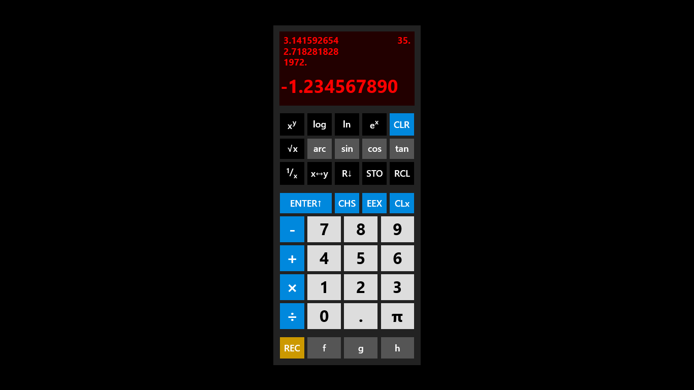 A modern remake of this classic RPN calculator of four decades ago, with the addition of full stack view and macro recording. This is a true microcode level emulator executing the ROM from 1972. See also: http://bit.ly/hp35emu