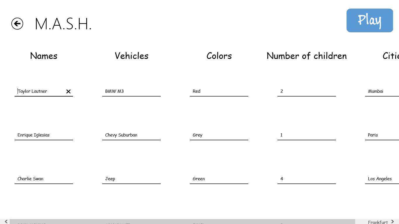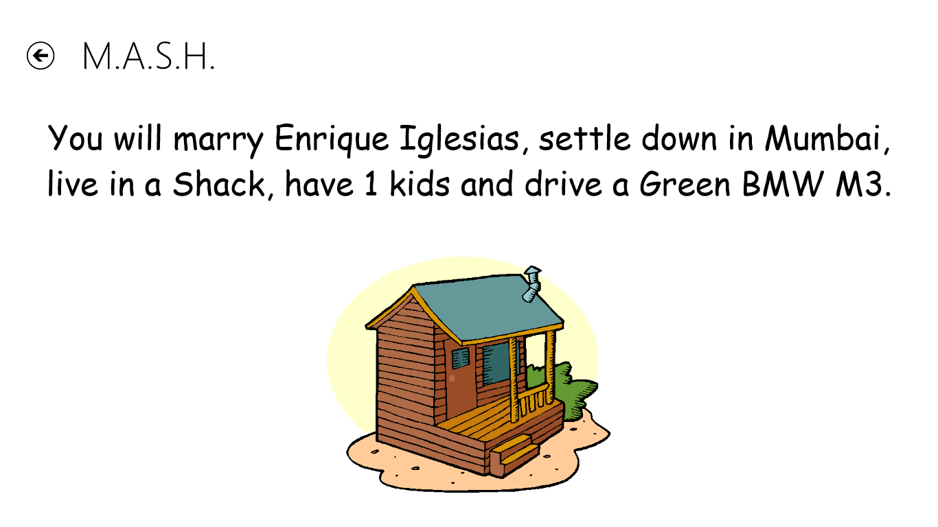 MASH is a game, commonly played by teenagers, intended to predict one's future. M.A.S.H. stands for mansion, apartment, shack, and house. The game revolves around the most common categories: the car, the kind of house, the partner, and the number of children. A spiral is drawn, and the number of times that spiral crosses a line determines the amount of rotations used per round. After each rotation, the word that you land on is crossed off. By the end of the game, you will have 1 words left in each category. This is considered the player's future. The objects in each category may be negative (e.g. someone the person does not like as a partner, something like a Yugo as a car) however some may be positive (e.g. someone the person does like as a partner, something like a Ferrari as a car).