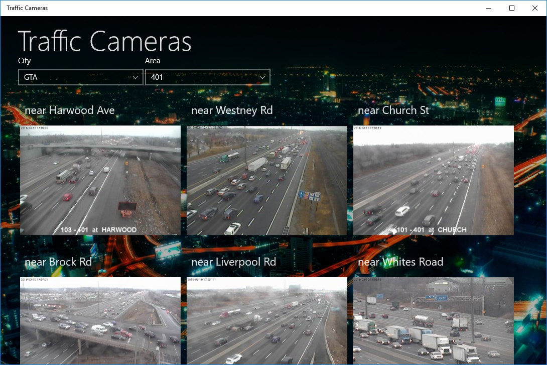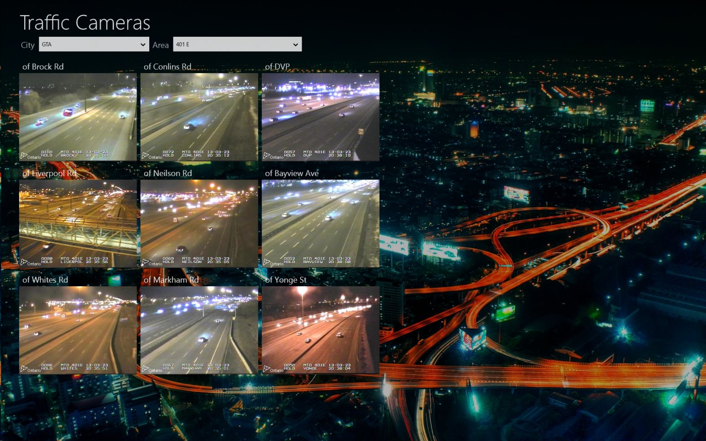 Displays photos from Canadian cities with current highway traffic conditions. Included cities in this release include Toronto, Ottawa, London, Mississauga, Niagara, Burlington, Windsor and Kingston.