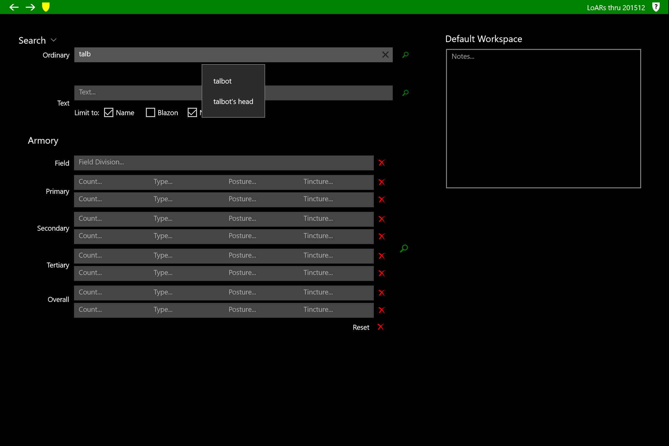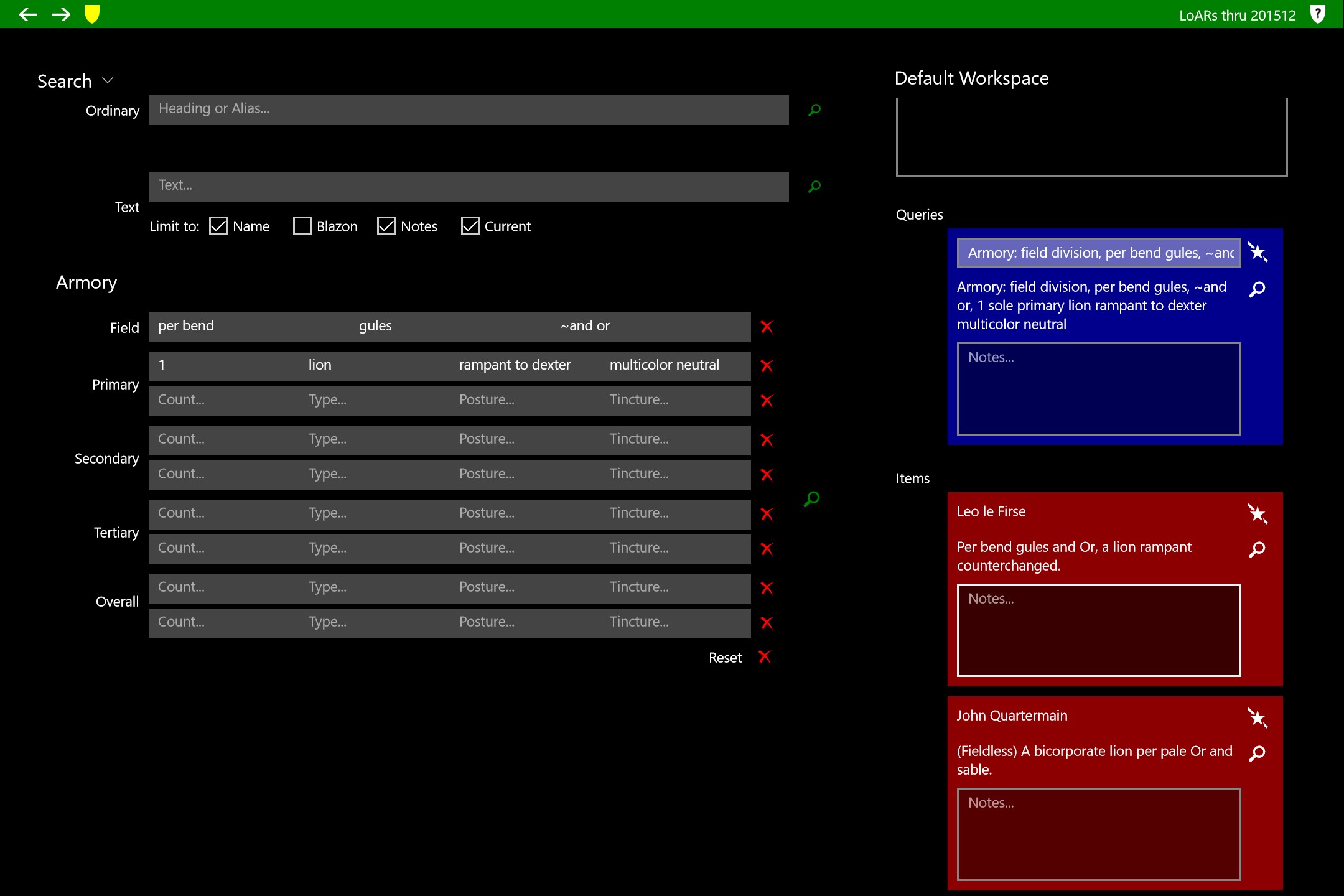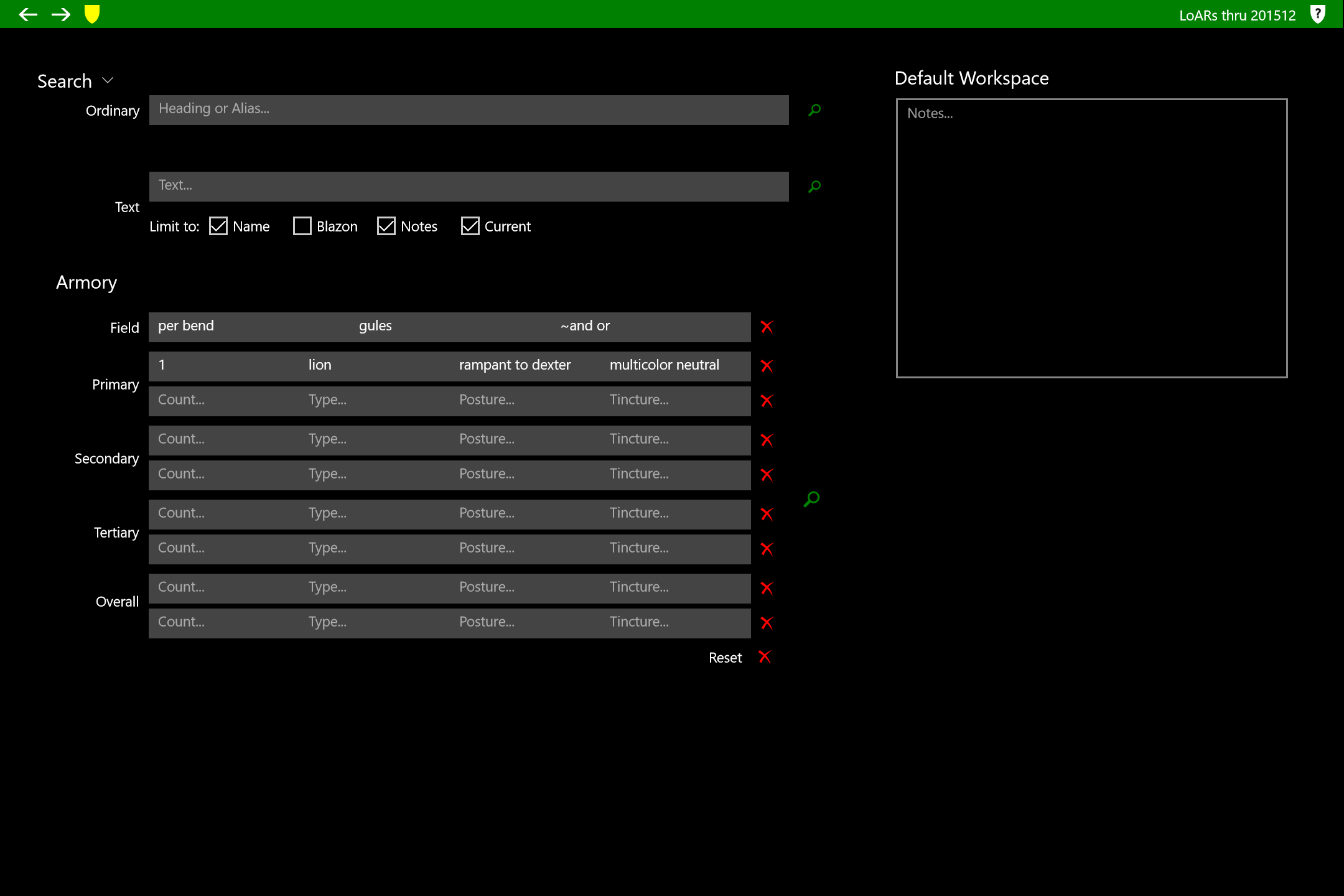 Perform complex armory searches -- without an internet connection or deep knowledge of complex search techniquesText search over Name, Blazon, or Notes, using a fuzzy index and a scoring algorithmUse Da\'ud notation, international keyboard, or skip accents altogetherAutocomplete-enabled Ordinary search, with automatic inclusion of related headingsUse common charge names instead of remembering the category name (no need for "METC")Database built and distributed separatelyLive Tile shows current LOAR version and randomly selected blazonsSave items and queries to a workspace, with notesSelect and copy item text, or query results, with or without detailsShare integration (text and HTML)Integration with the Pictorial Dictionary of HeraldryPin items and queries to the Start menuEdit queries from the query results pageSupport for small screensSearch Family Search, the MED, and LOAR (online only).Offline reference library support