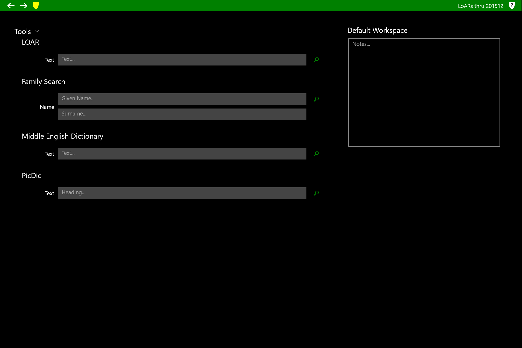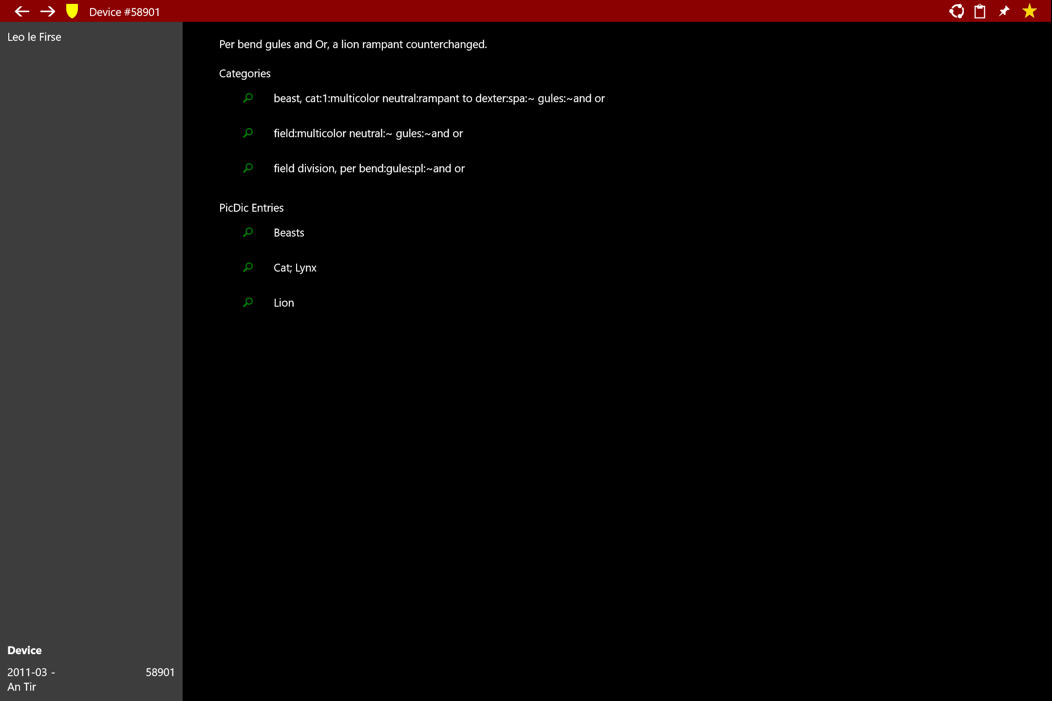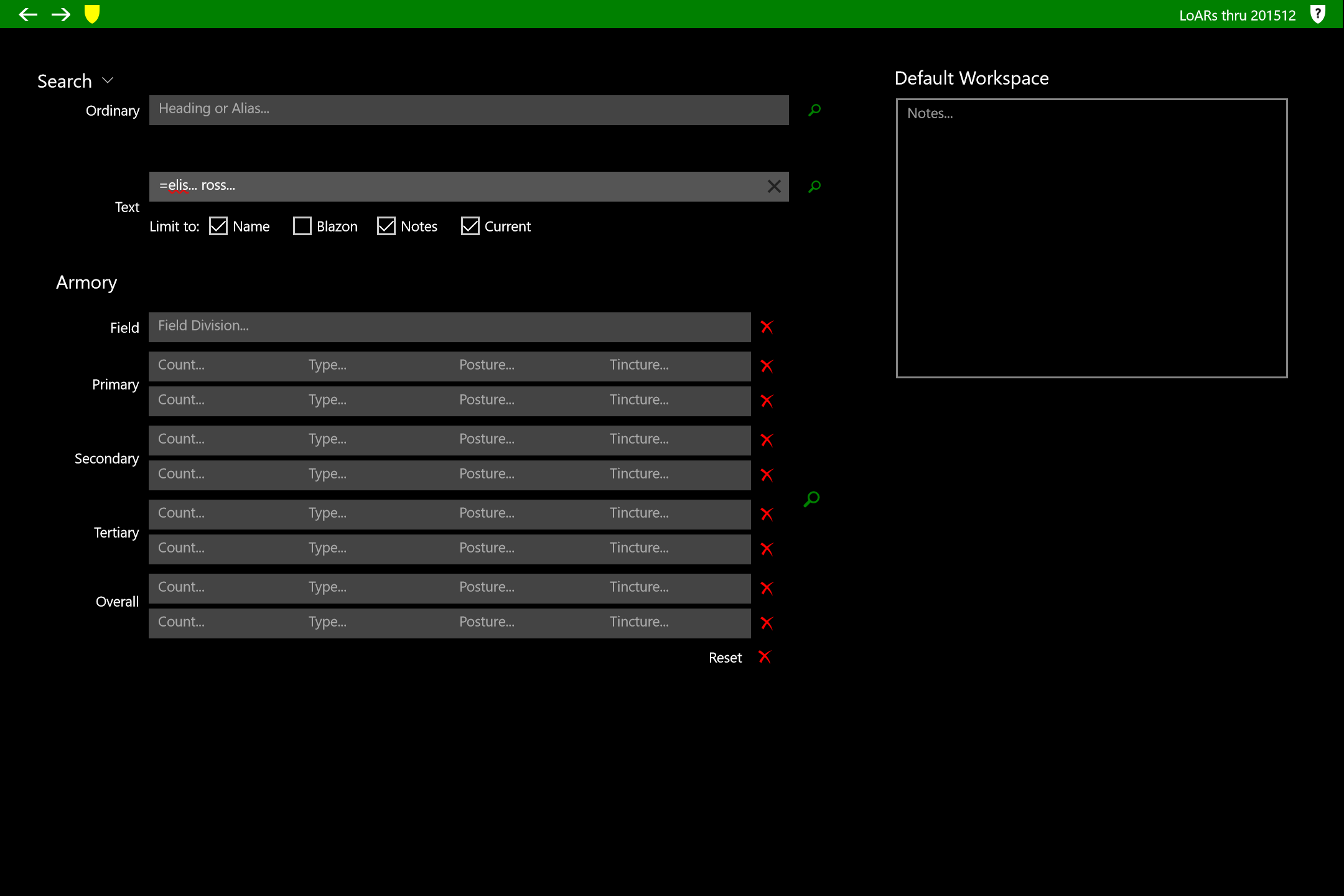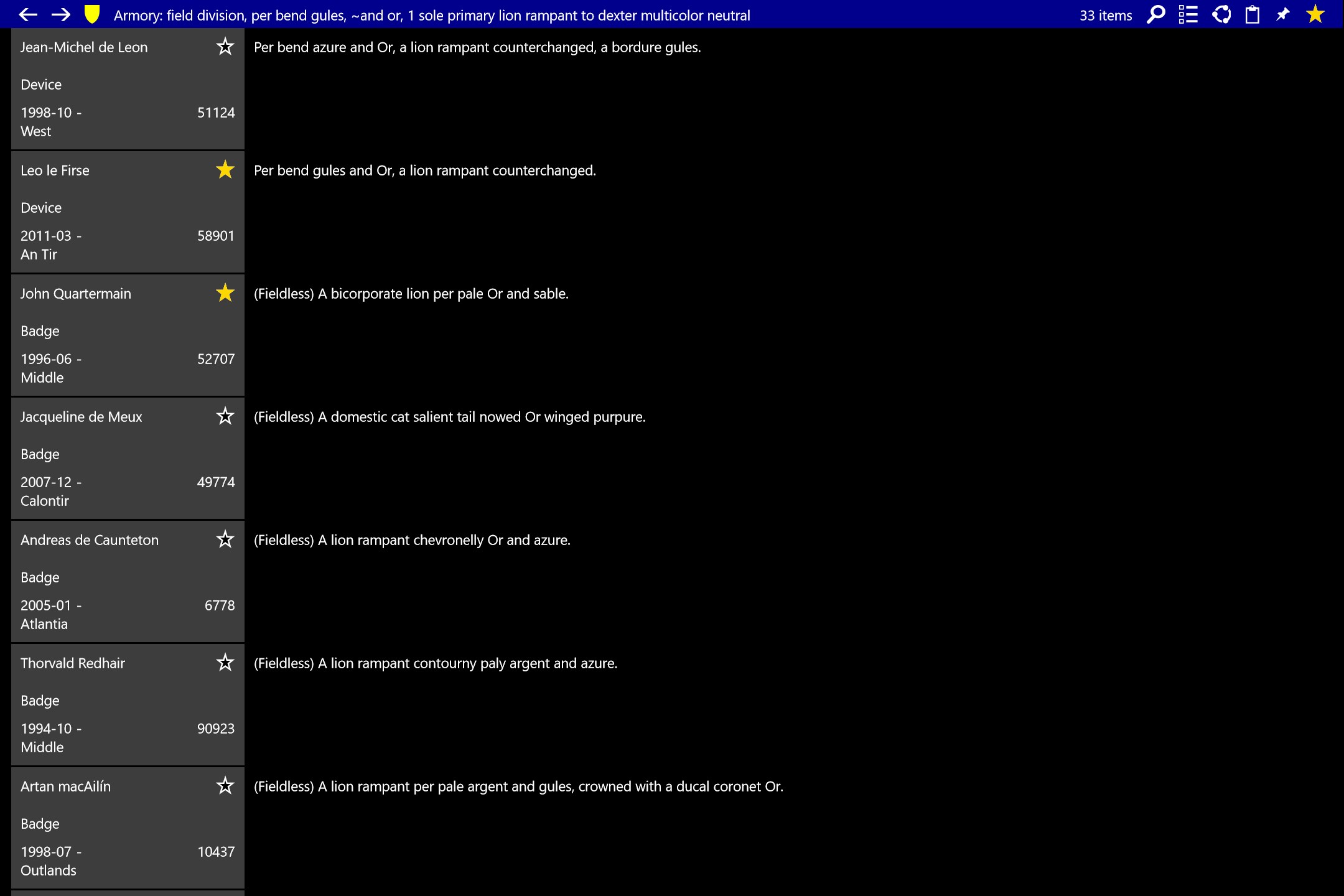 Perform complex armory searches -- without an internet connection or deep knowledge of complex search techniquesText search over Name, Blazon, or Notes, using a fuzzy index and a scoring algorithmUse Da\'ud notation, international keyboard, or skip accents altogetherAutocomplete-enabled Ordinary search, with automatic inclusion of related headingsUse common charge names instead of remembering the category name (no need for "METC")Database built and distributed separatelyLive Tile shows current LOAR version and randomly selected blazonsSave items and queries to a workspace, with notesSelect and copy item text, or query results, with or without detailsShare integration (text and HTML)Integration with the Pictorial Dictionary of HeraldryPin items and queries to the Start menuEdit queries from the query results pageSupport for small screensSearch Family Search, the MED, and LOAR (online only).Offline reference library support