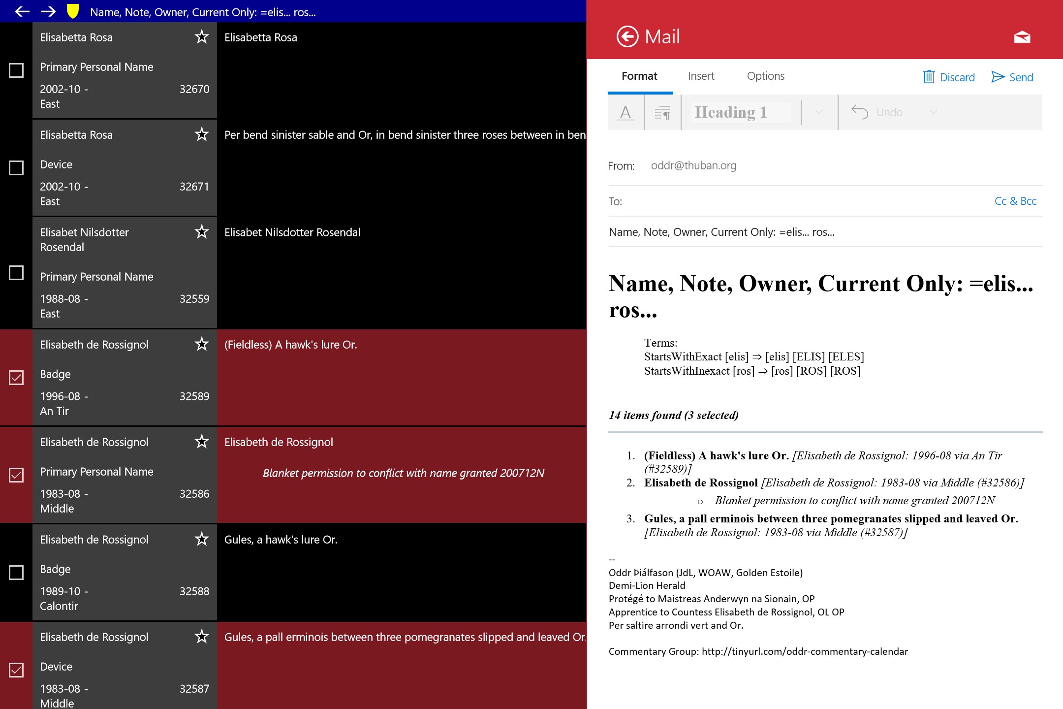 v3.3.1: Name searches have changed. If you do not include Blazon or Notes, it will presume a name search for purposes of conflict, and will display just the list of unique matching names rather than all matching items. Clicking on a result will take you to the set of items with that matching name.