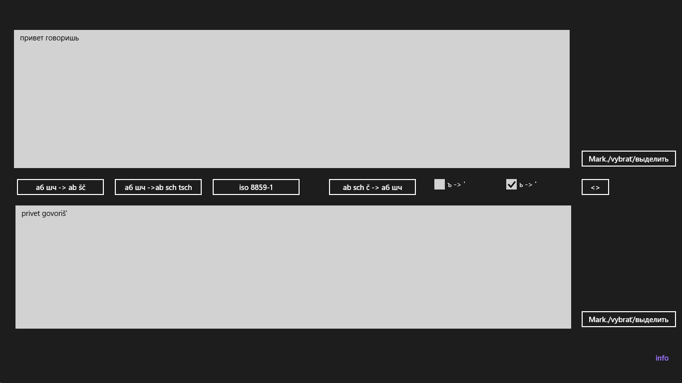 Diese App erlaubt das Konvertieren von Kyrillischer Schrift (Russische Ausprägung) zu Lateinischer unter Berücksichtigung von wahlweise Deutscher oder Tschechisch/Slowakischer Transliteration.
