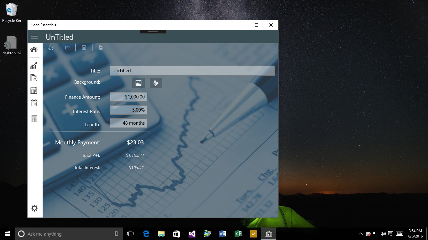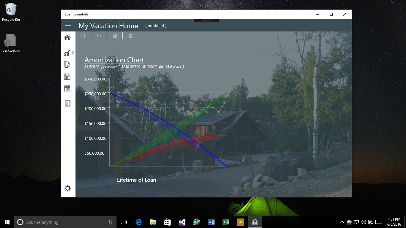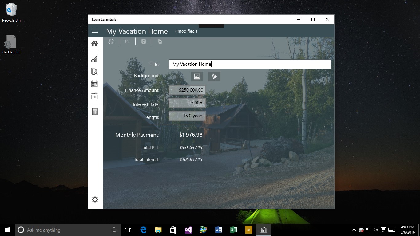 Allows for named loan modelingLoans can be named for retrieval and identificationPerform loan analysis by comparing rates and durations.Loans can contain background images for improved representationMonth by month or Year-to-year views.