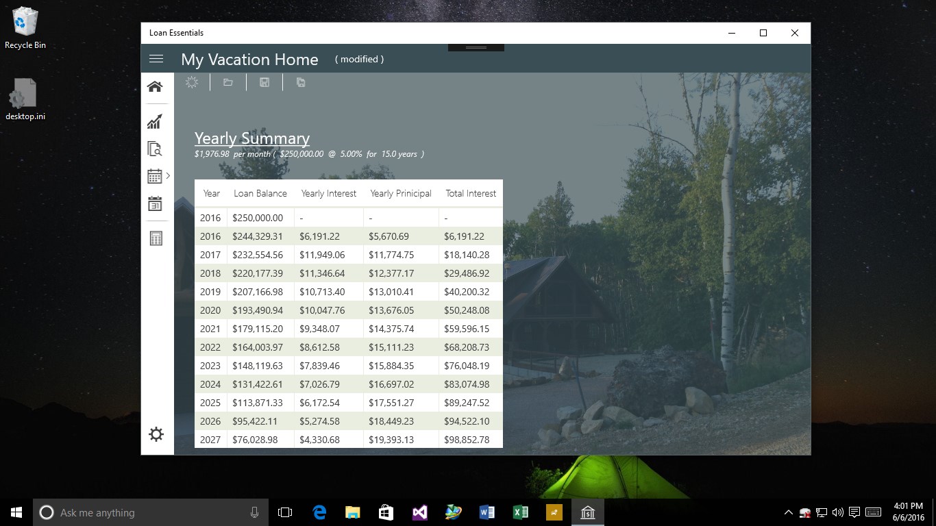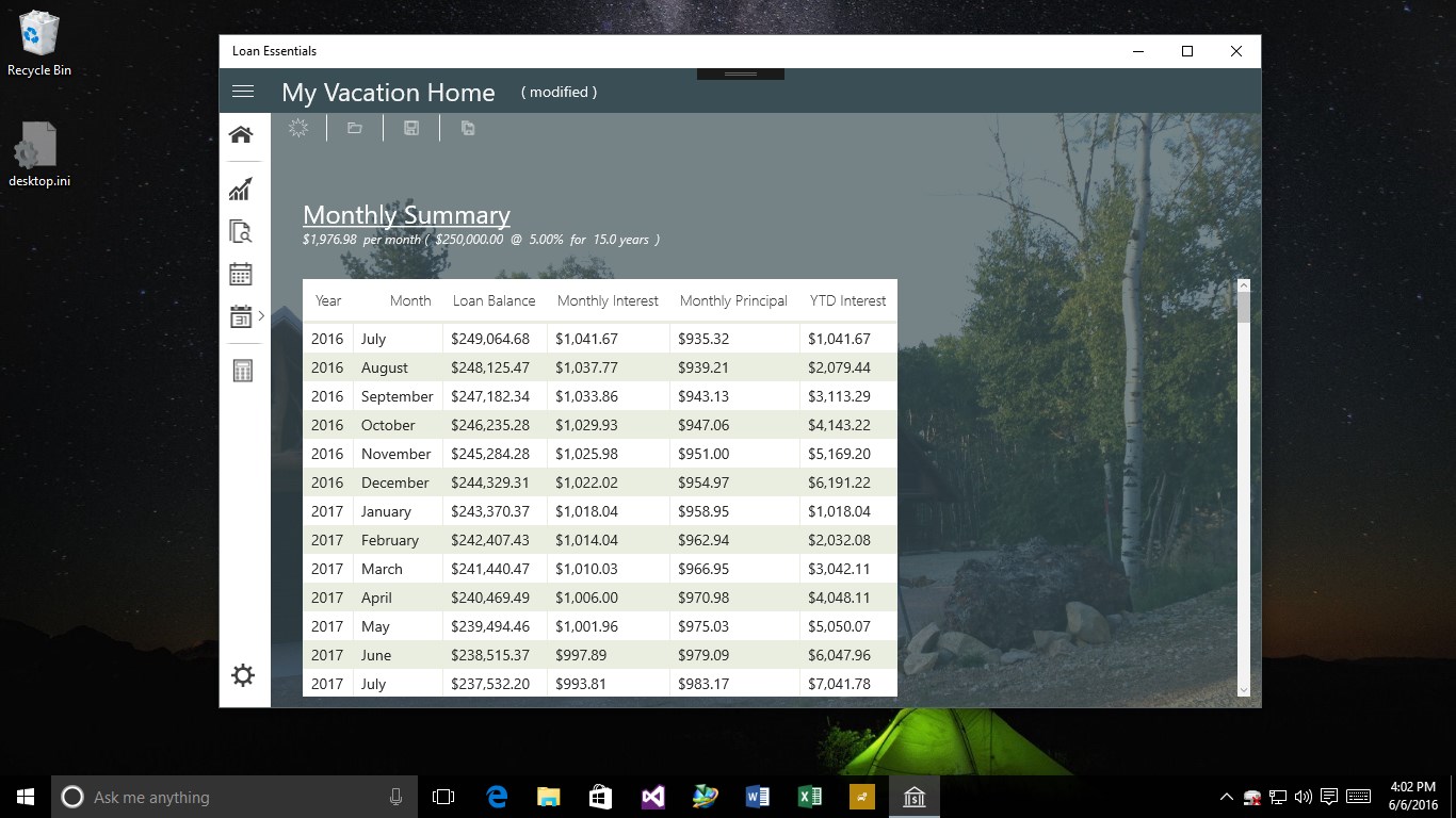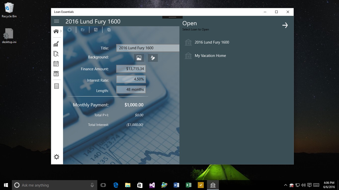 Allows for named loan modelingLoans can be named for retrieval and identificationPerform loan analysis by comparing rates and durations.Loans can contain background images for improved representationMonth by month or Year-to-year views.