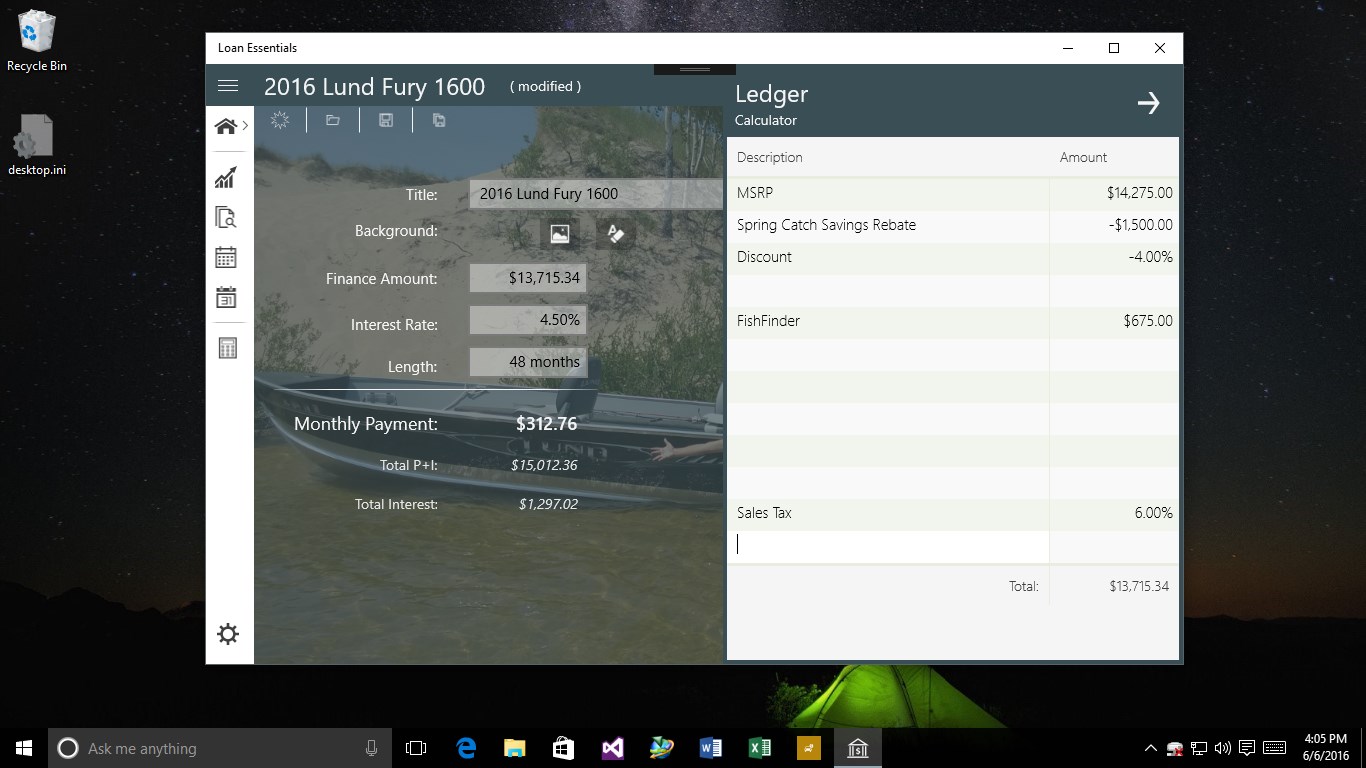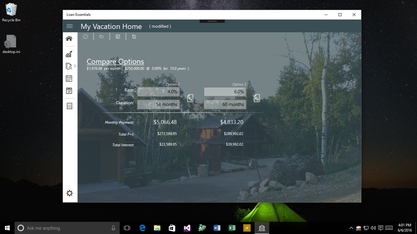 Loan Essentials allows the user to make decisions regarding potential purchases or refinance. Tools include ability to determine payment, monthly, yearly summaries, compare up to two other loan options, set the background for visual indication of the asset, and finally ability to save the loan for later retrieval.